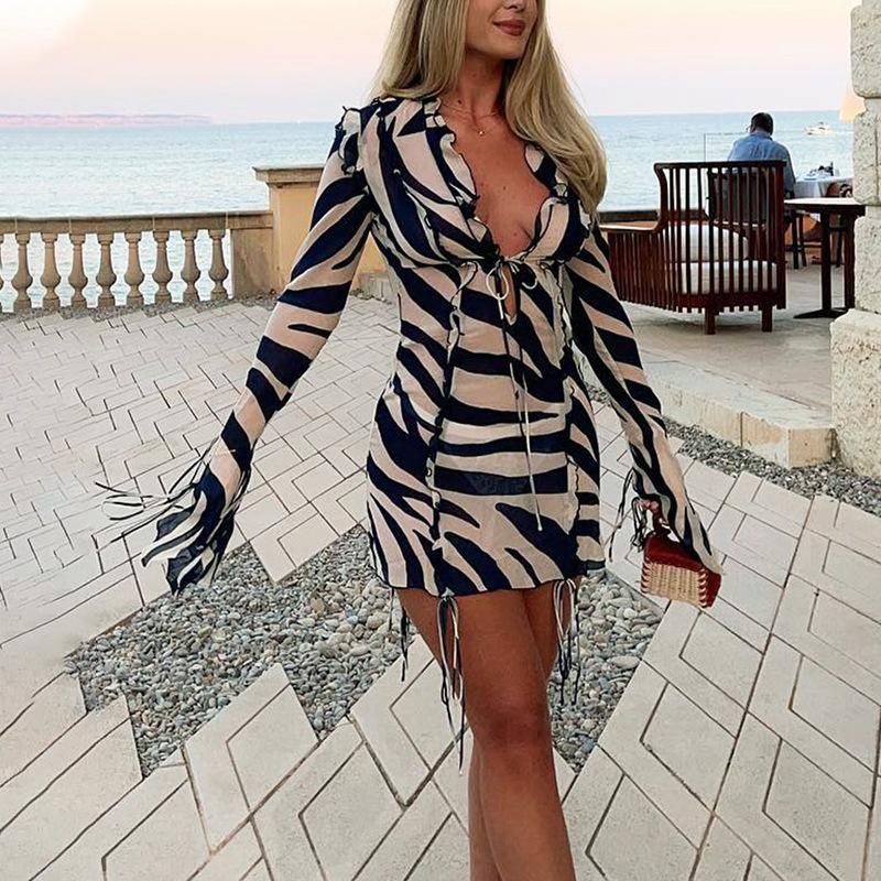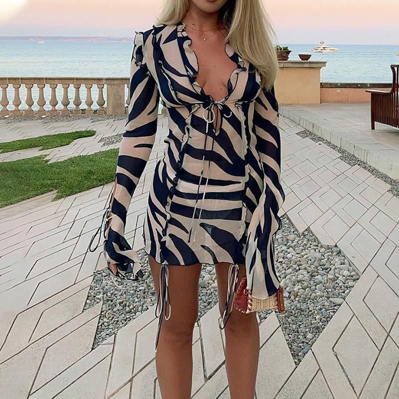 Buy 2022 Summer Beach Dress Printed Long Sleeve Ruffle Mesh Tight Bandage Perspective Sexy Dress in Nigeria