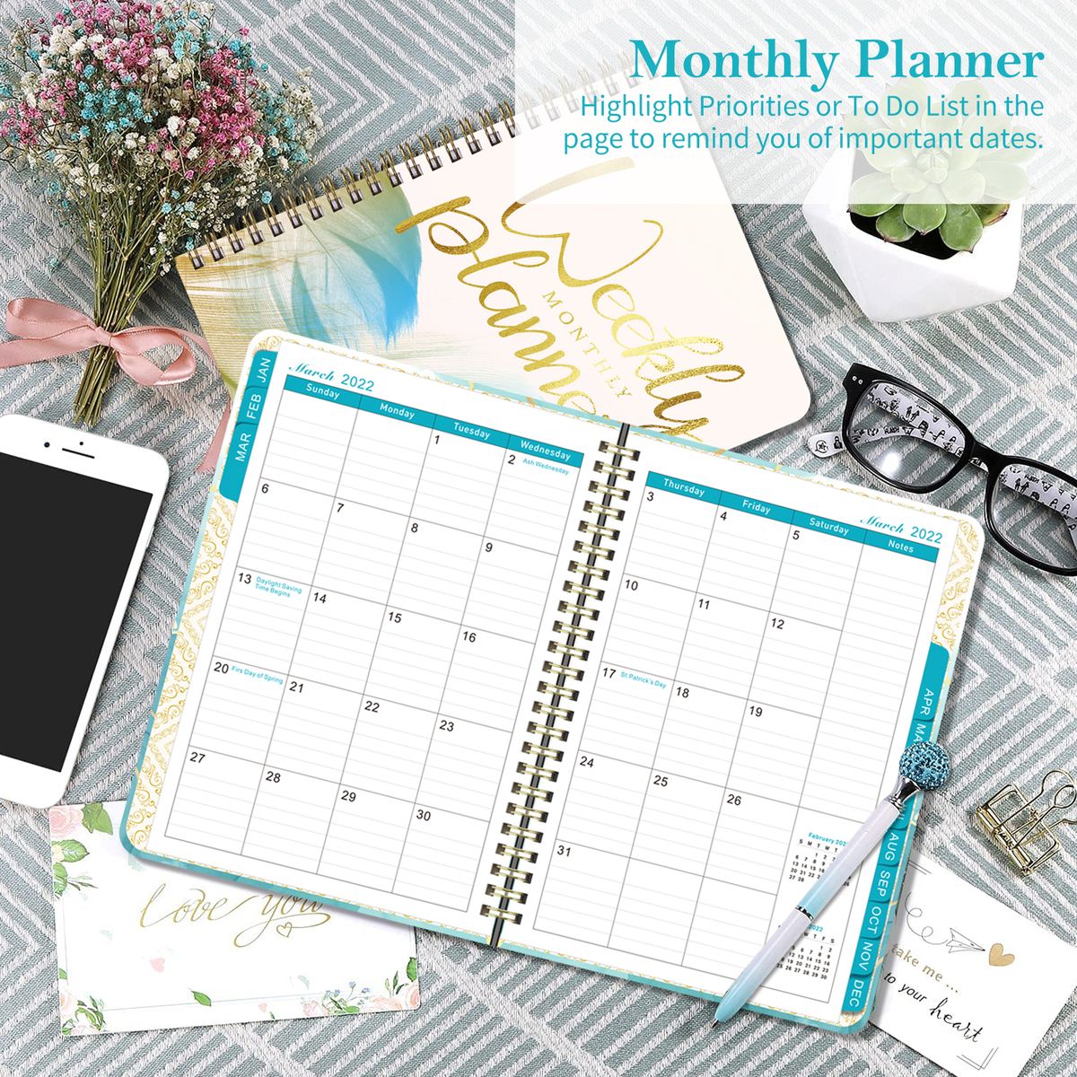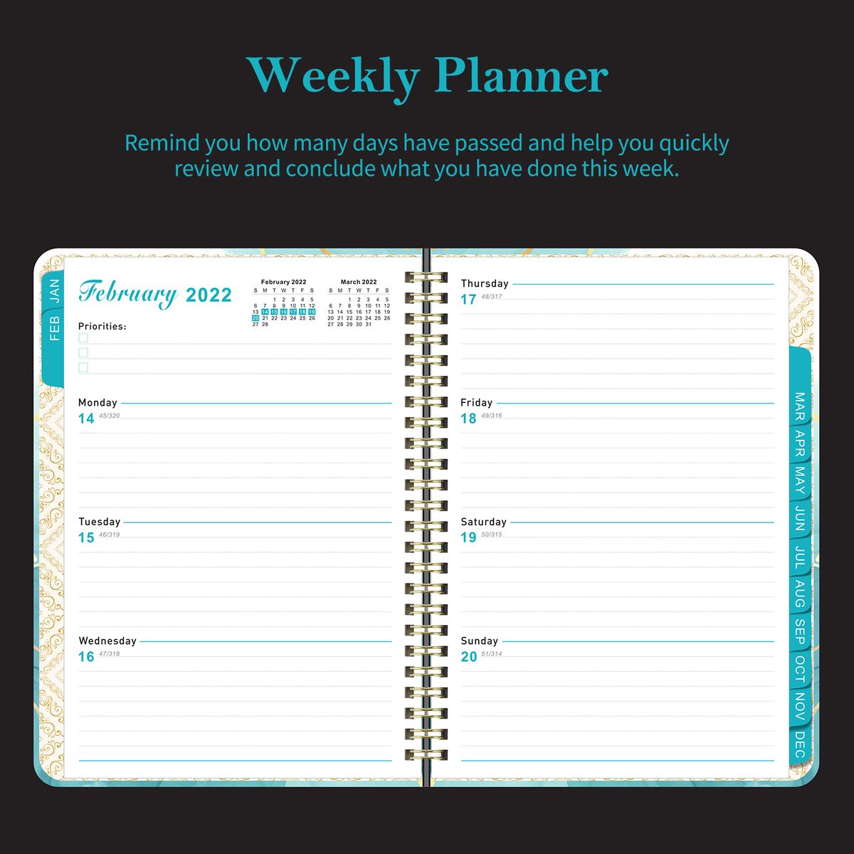 Plan your days and weeks. Highlight Priorities, To Do List or summary in the pages to remind you of important dates.