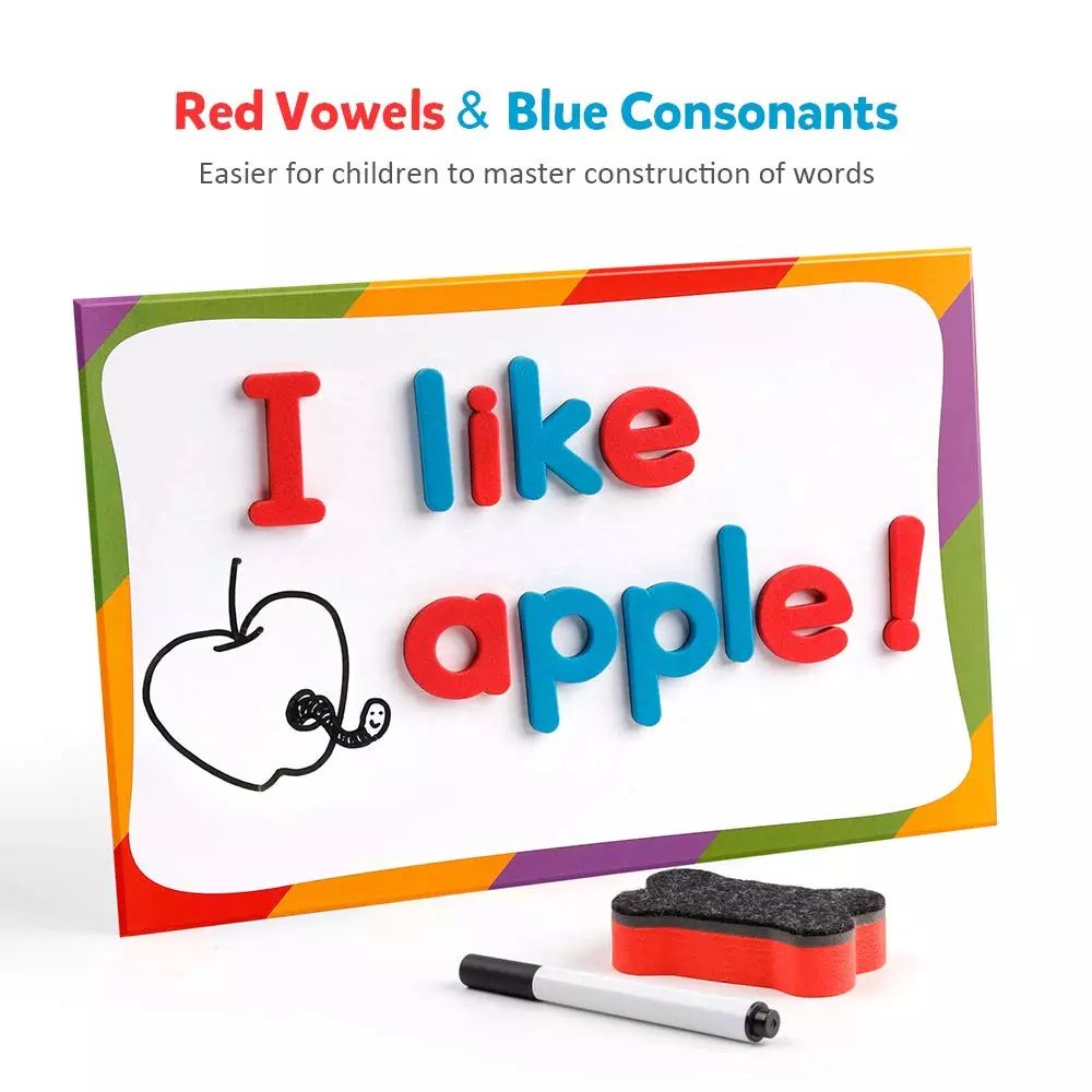 PERFECT FOR YOUR KID: One of the greatest challenges of the primary school is learning to write and spell. In order to help kids learn the alphabet and form their first sentences, we designed a special school magnetic letter and board duo that will make learning the basics of reading and writing easy and fun.SPECIAL STORAGE: In order to teach your kids how to be more organized, we have included a special alphabet storage box with different compartments for the letters, as well as a special place for the double magnetic board. This way, the transport of the spelling set is easy and taking it to school is a piece of cake.EXTRA LARGE PACK: Spelling is a great challenge and your toddler deserves to have the best resources. That is why we have included in the special spelling box 208 letters, a white board, a special pen and one eraser, so kids can learn both alphabet and punctuation.PREMIUM QUALITY MATERIALS: Because your children deserve the best, we have made sure that the alphabet learning toy set is safe to use, being made of eco-friendly EVA foam with full magnet on the back. The letters will not break and are non-toxic, being suitable for kid from the age of 3 years old.