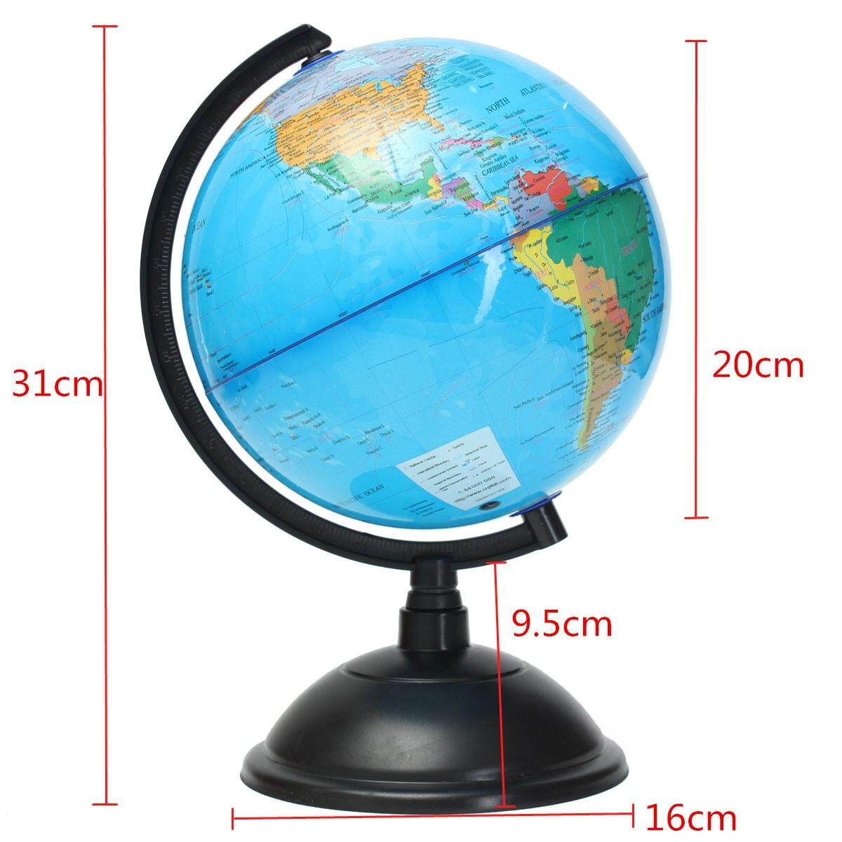 It features up-to-date cartography, vibrant blue oceans and landmasses with political boundaries. The globe is held by a semi meridian mounted on a durable black colored plastic base