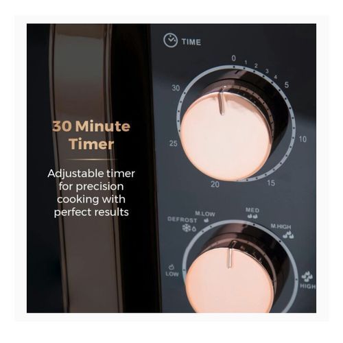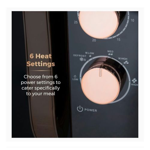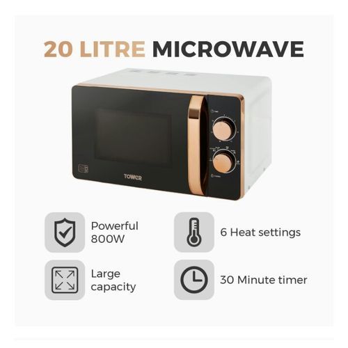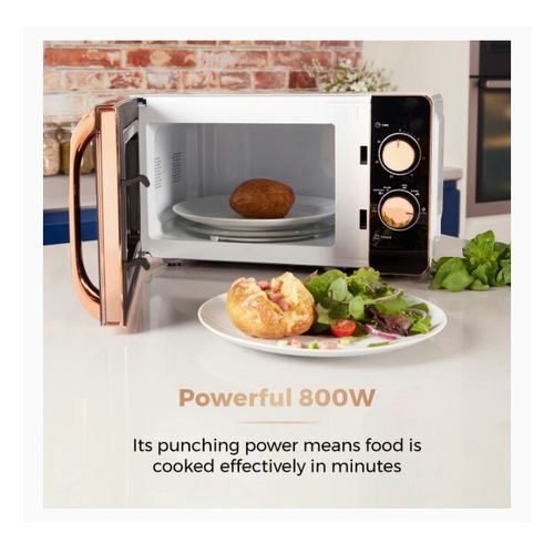 Packed with functionality surrounding elegant Rose Gold accents, this manual microwave is the perfect preparation tool for convenient cooking. Featuring five power levels and a defrost function you can tailor to a wide range of cooking requirements, with a 20 litre capacity that provides sufficient space to accommodate family size cooking. The 800W will cook, re-heat and defrost food in a matter of minutes, making this microwave a stylish and practical addition to any kitchen.