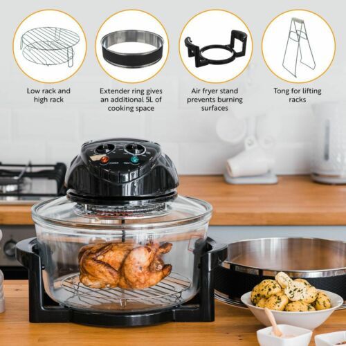 Can be used to cook full chickens, pork and beef, baked potatoes, pizza, burgers and frozen food