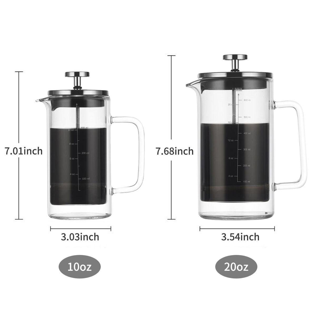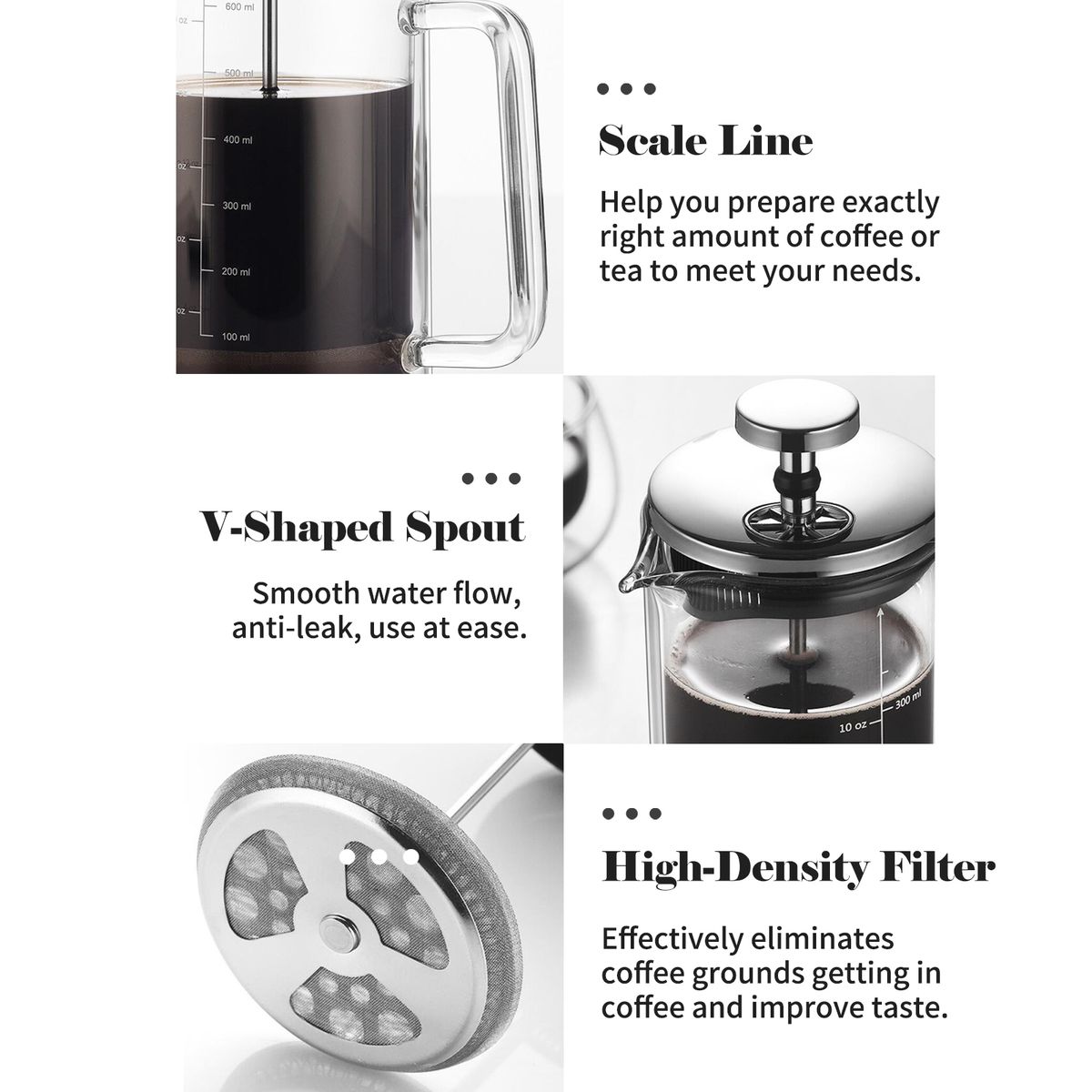 The French press coffee maker owns a high-density stainless steel filter, effectively eliminating coffee grounds getting in your coffee and offering delicious, smooth and full-flavored coffee.