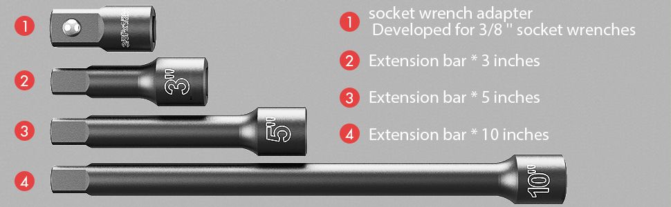 COMPLETE 20-PIECE KIT: Including 9-24 mm sockets to meet the needs of daily maintenance work. Equipped with 3\'\', 5\'\', 10\'\' extension bars for access to deep tapped holes. The adapter allows the sleeve to be used with a 3/8 electric wrench.