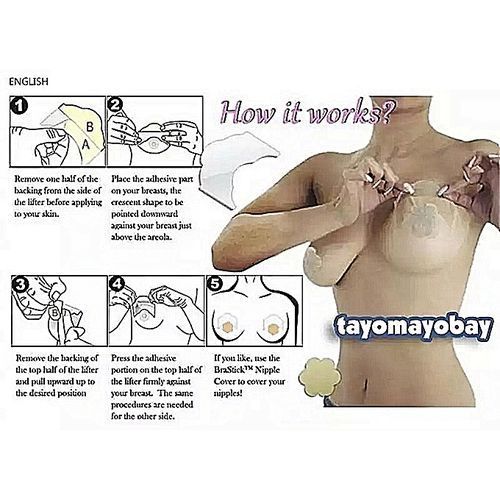 Instant Bare Breast Lifts are completely strapless solution to lifting your breasts while ensuring a naturally perky look in virtually any outfit. it makes the breast stand firm and looks youthful in appearance, you can lift each breast and re-align your nipple to a higher position, even if you are larger than A-D Cup. It reduces pulling and slipping of the straps when worn with a bra and are also a simple solution to the inches back bulge. Instant Bare Breast Lifts are the perfect solution for 24-hour breast support that is virtually invisible. It is comfortable and easy to uses imply place, peel and gently lift to get your preferred shape, support and confidence that every woman desires, it can be used with or without a bra. Bare lift is for saggy breast, for strapless and backless dresses. Easy to use. Skin Friendly. Latex Free - No allergies Comfortable and Secure Fits A, B, C and D Cups Invisible Tape - discreet, can be worn with your bikini Waterproof - can be worn with your swim suit. Defy gravity without surgery or a bra Medical Grade Tape - perfectly safe Get back your youthful look without surgery Care label Store at Room Temperature Be sure to use them on the breasts BEFORE rubbing any creams or lotions to ensure they last all day.5pairs goes for the stated amount above. No side effects.