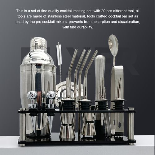 This is a set of fine quality cocktail making set, with 20 pcs different tool, all tools are made of stainless steel material, tools crafted cocktail bar set as used by the pro cocktail mixers, prevents from absorption and discoloration, with fine durability. An perfect gift for both starter and professional mixers alike, as all essential tools are included. You can have a try.