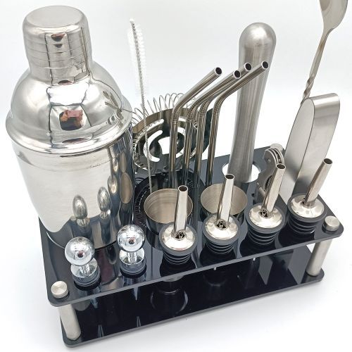 Cocktail set have all essential tools, contains 1 x Swizzle Stick, 1 x 750ml Cup, 4 x Bottle Stopper, 1 x Can Opener, 1 x Ice Clip, 1 x 15/30ml Measuring Cup, 1 x 25/50ml Measuring Cup, 1 x Stand, 4 x Bend Suction Tube, 1 x Ice Strainer, 1 x Muddler, 2 x Stainless Steel Bottle Stopper, 1 x Suction Tube Brush.