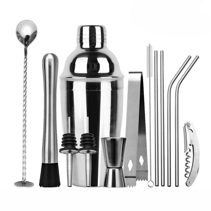 Cocktail set have all essential tools, contains 1 * Swizzle Stick, 1 * 750ml Cup, 4 * Bottle Stopper, 1 * Can Opener, 1 * Ice Clip, 1 * 15/30ml Measuring Cup, 1 * 25/50ml Measuring Cup, 1 * Wine Stand, 4 * Bend Suction Tube, 1 * Ice Strainer, 1 * Muddler, 2 * Stainless Steel Bottle Stopper, 1 * Suction Tube Brush.