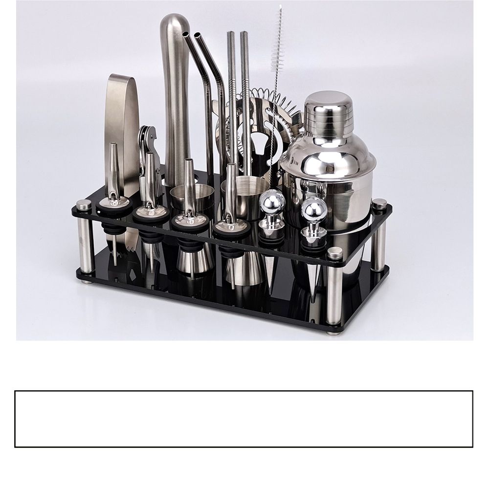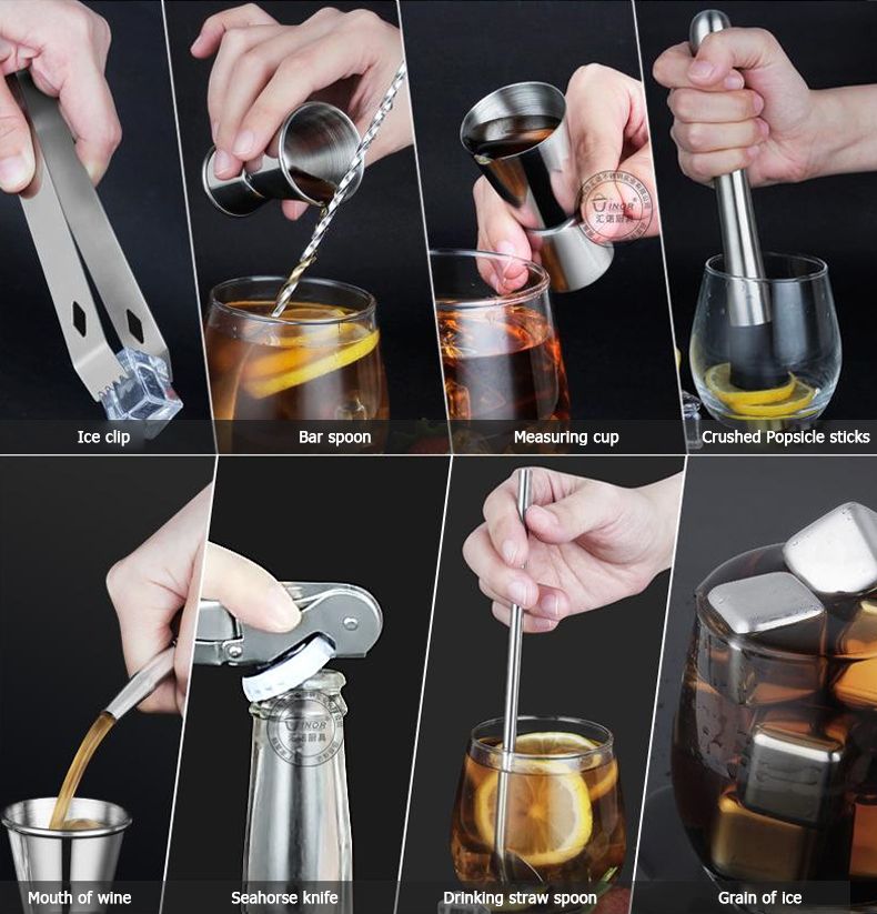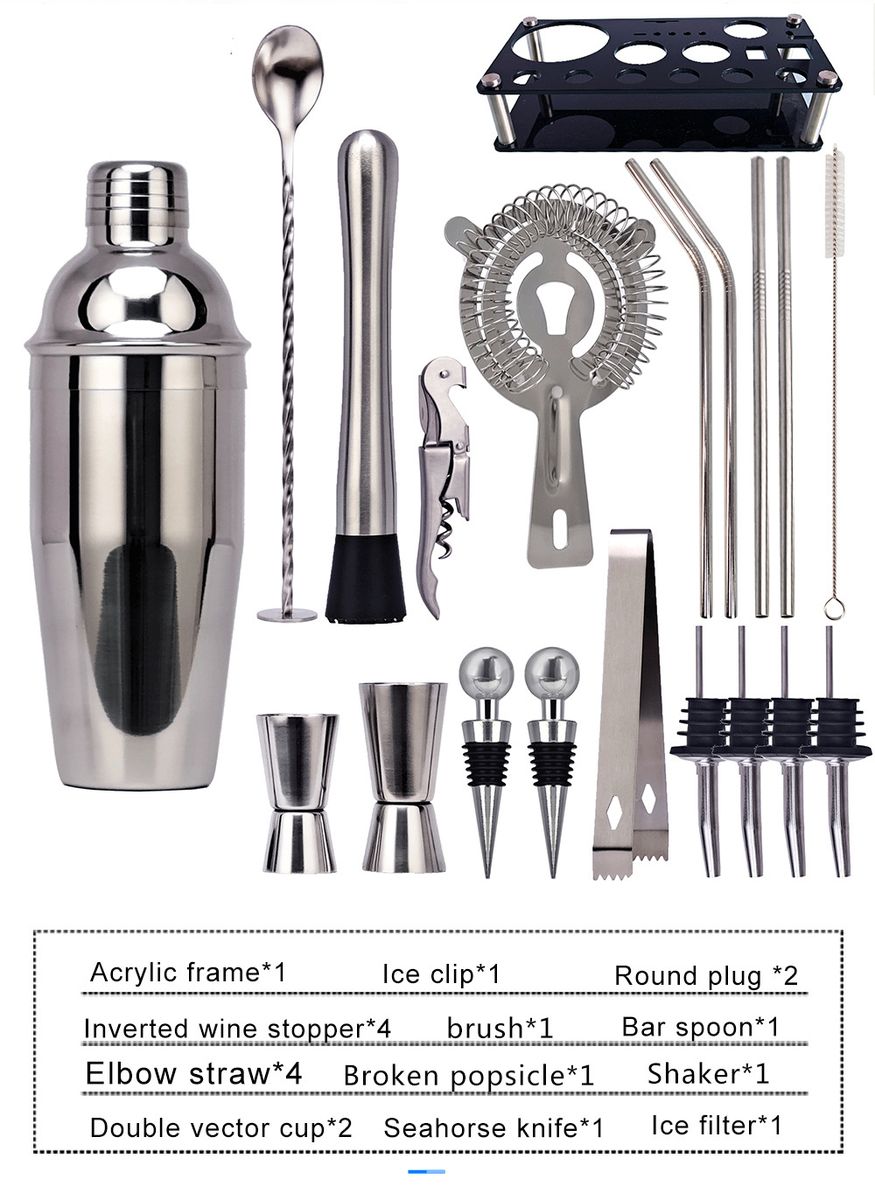 Cocktail set have all essential tools, contains 1 * Swizzle Stick, 1 * 750ml Cup, 4 * Bottle Stopper, 1 * Can Opener, 1 * Ice Clip, 1 * 15/30ml Measuring Cup, 1 * 25/50ml Measuring Cup, 1 * Wine Stand, 4 * Bend Suction Tube, 1 * Ice Strainer, 1 * Muddler, 2 * Stainless Steel Bottle Stopper, 1 * Suction Tube Brush.