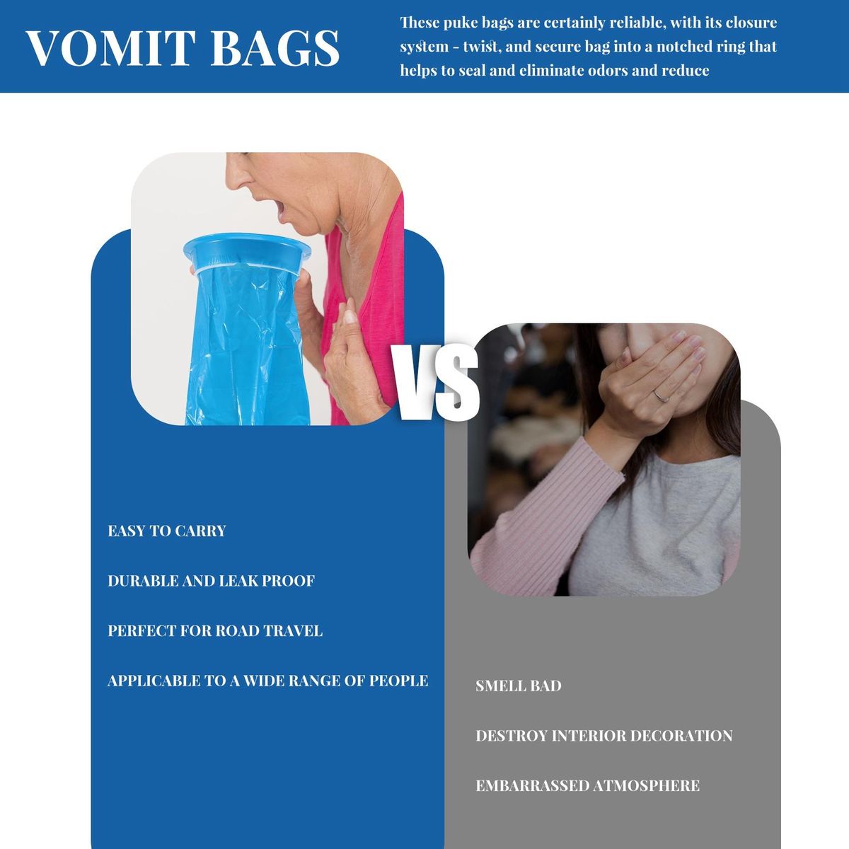 Reliable & Sealed - These puke bags are certainly reliable, with its closure system - twist, and secure bag into a notched ring that helps to seal and eliminate odors and reduce contamination.