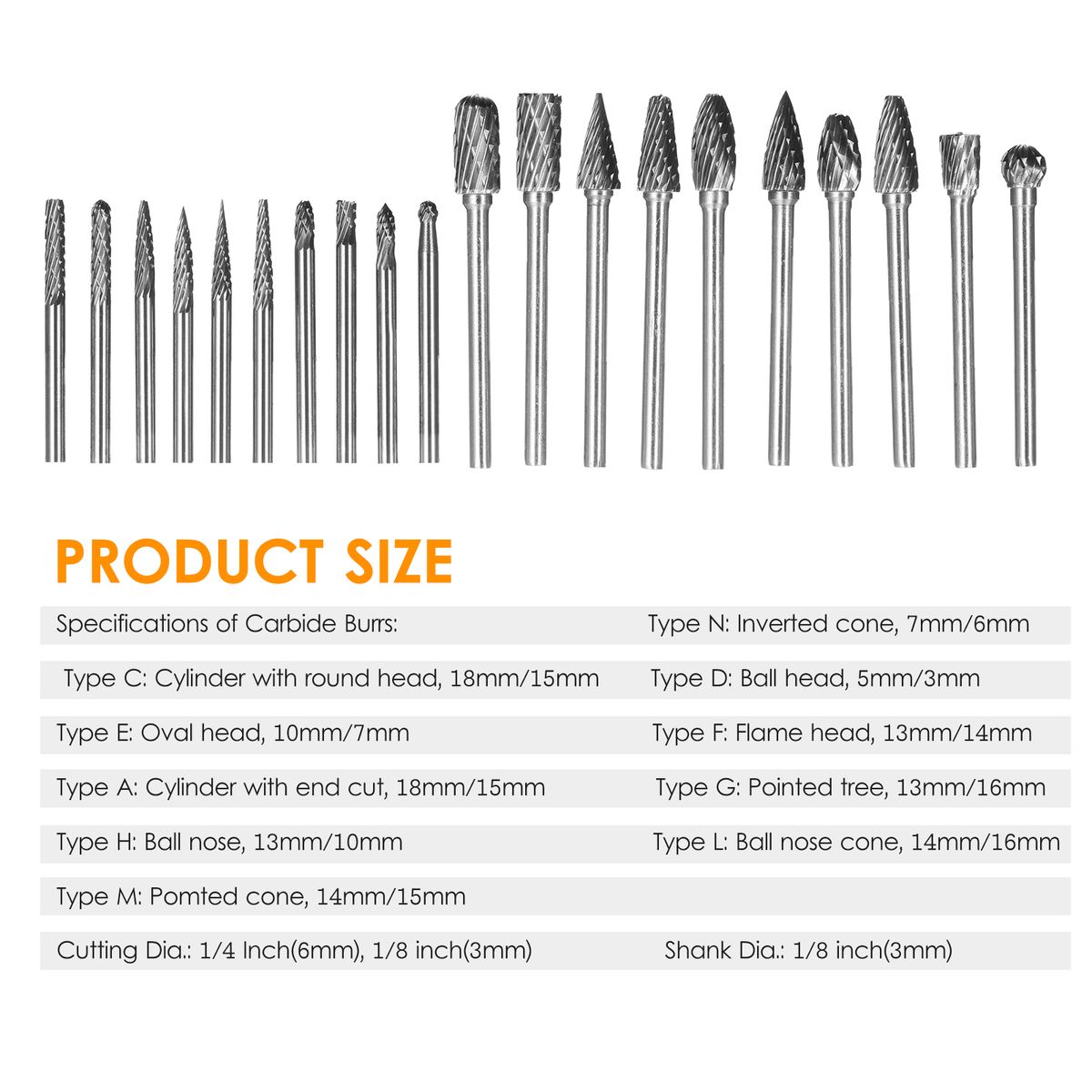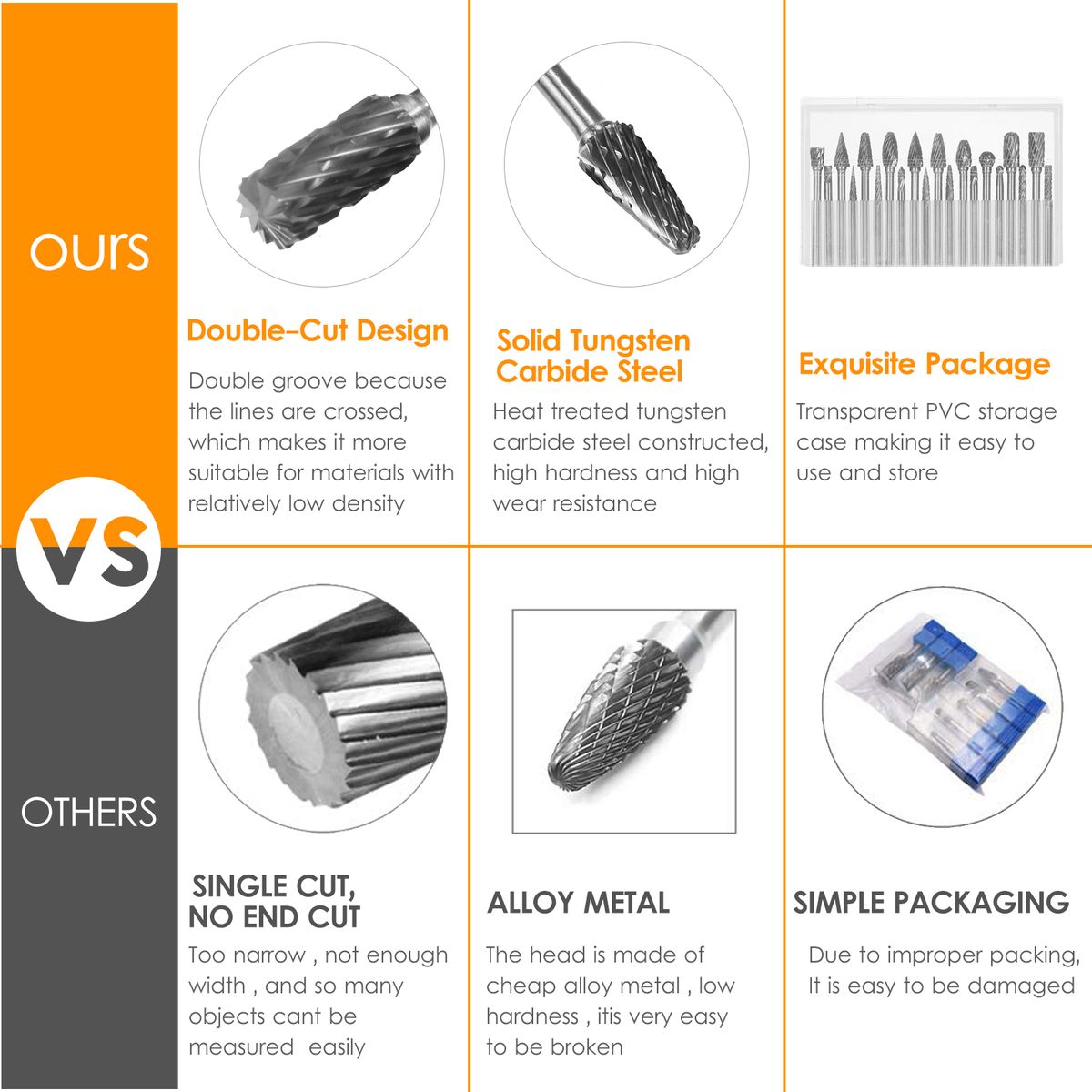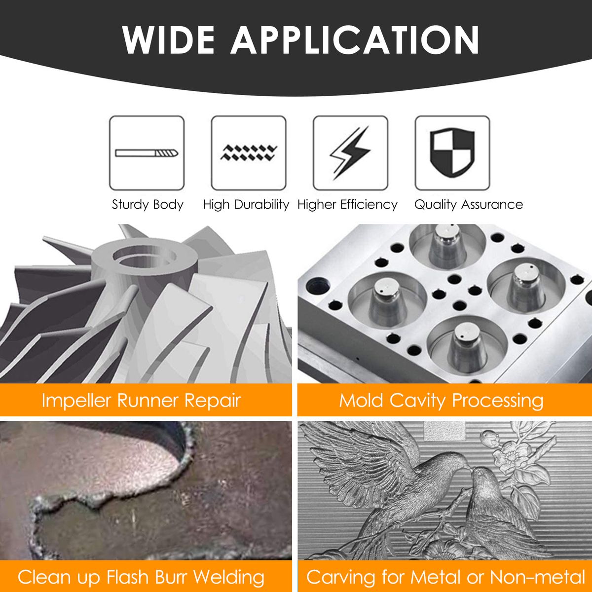 Premium Quality -- High quality heat-treated tungsten carbide construct rotary burr set with high quality finish provide good toughness and resistance, sharp and sturdy.