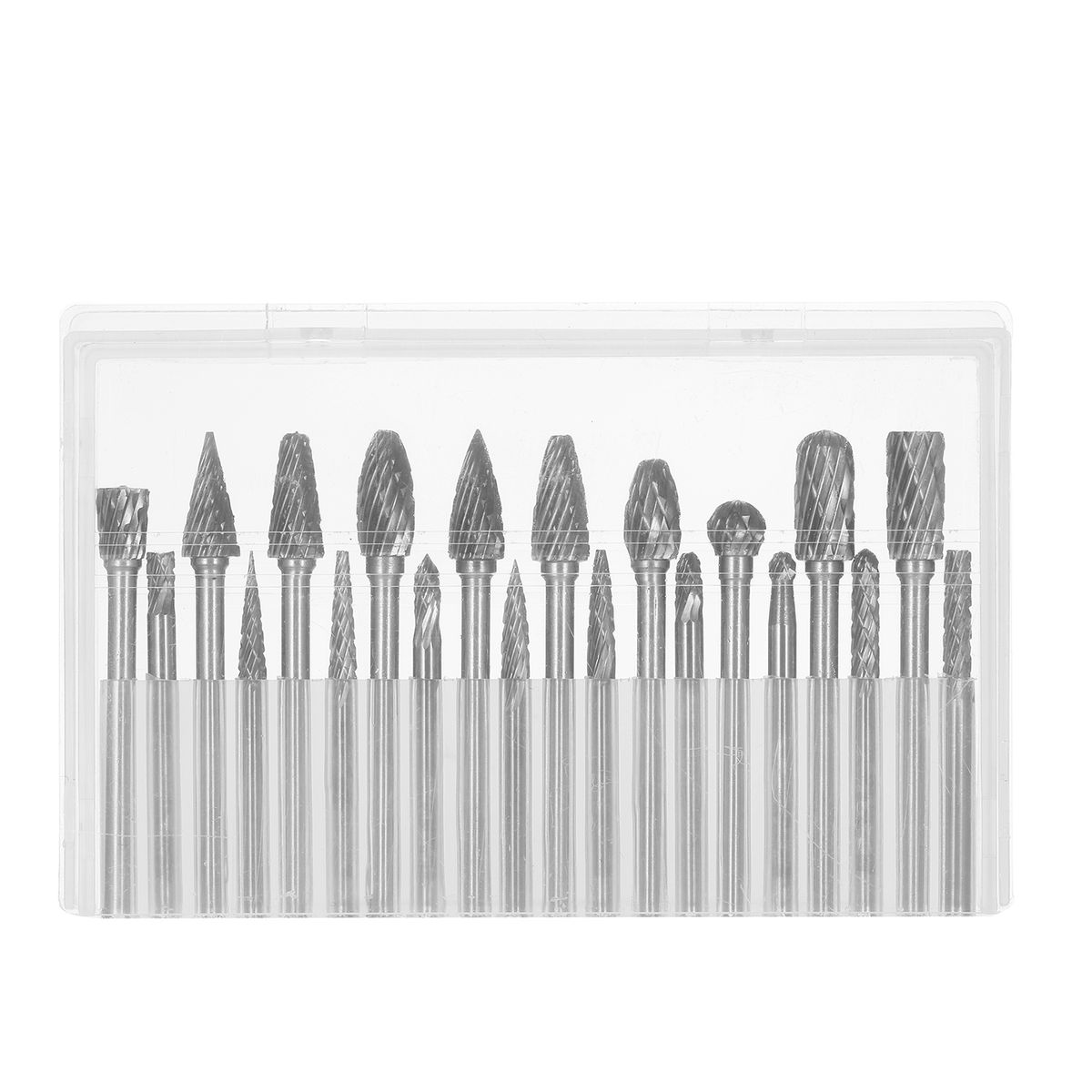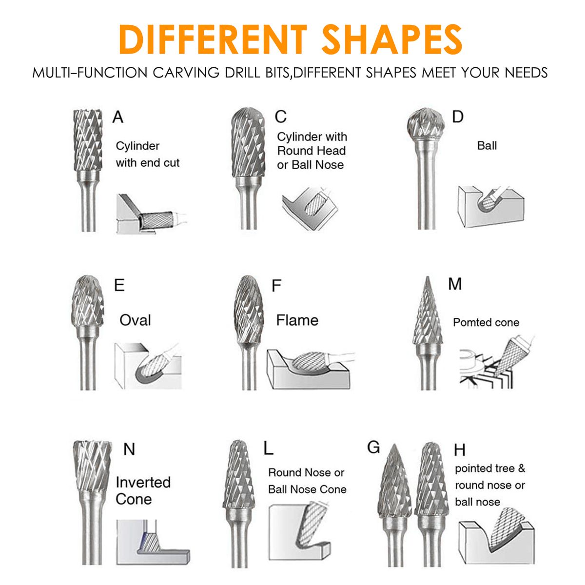 Versatile Die Grinder Bits -- 20 different types sizes of carbide rotary file bits, oval, inverted cone, pointed cone, ball nose cone, ball nose, pointed tree nose, flame, ball, cylinder with round head and cylinder with end cut to meet your different needs.