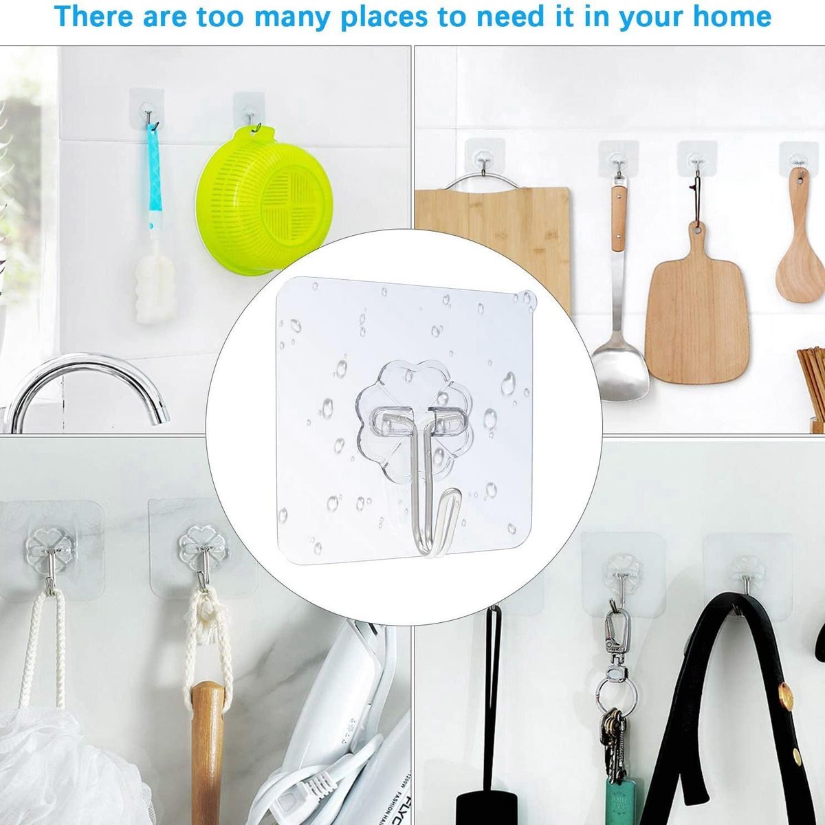 5. Common uses: Self-adhesive hooks are very suitable for kitchens, bathrooms, bedrooms, offices and homes, for hanging cups, pots, towels, bathrobes, keys, hats, clothes, photo frames, etc.