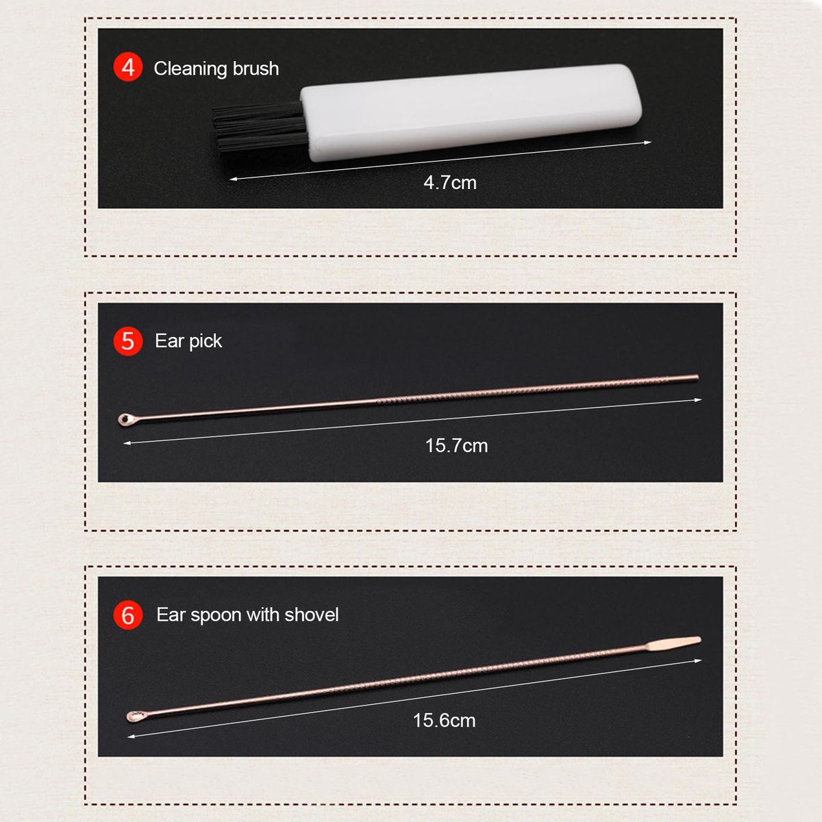 6 ear spoons(1 luminous ear pick, 2 spiral ear pick, etc.), 2 tweezers, 1 cleaning brush, 2 ear scraper, 9 feather ear pick are included.