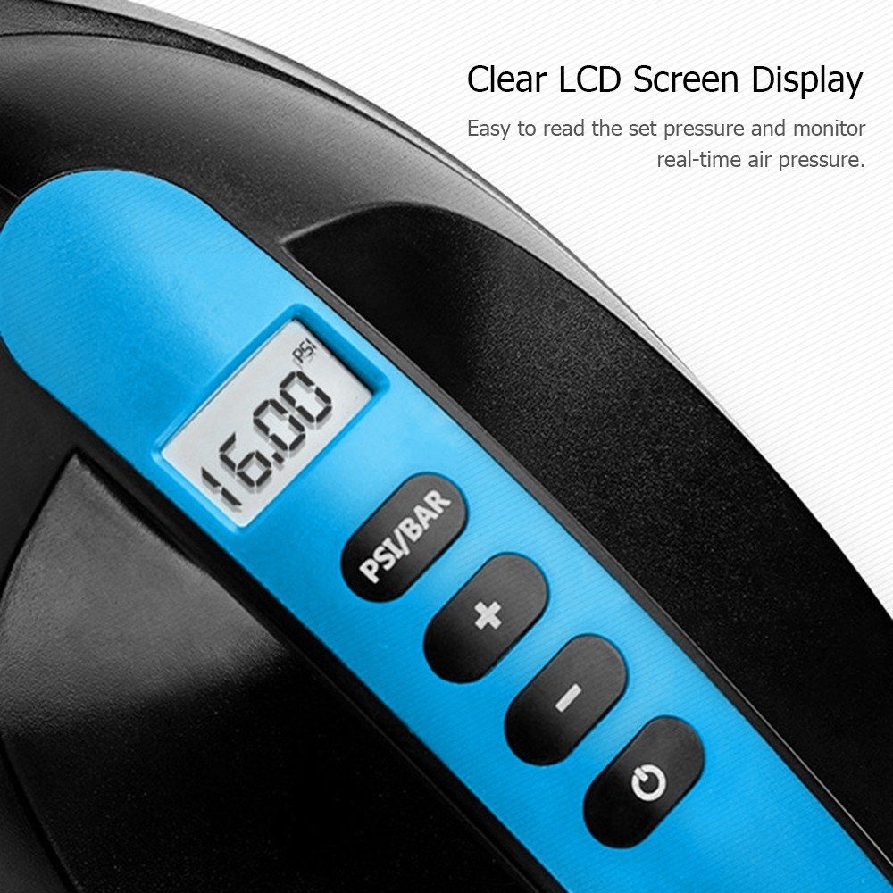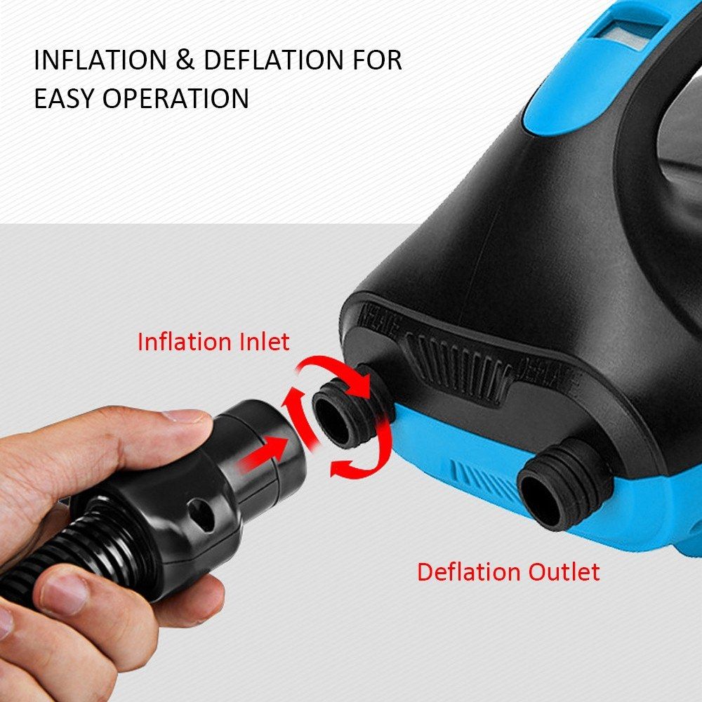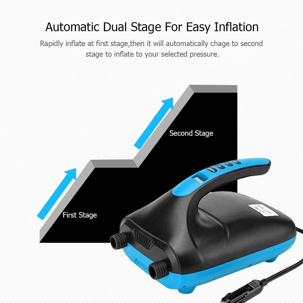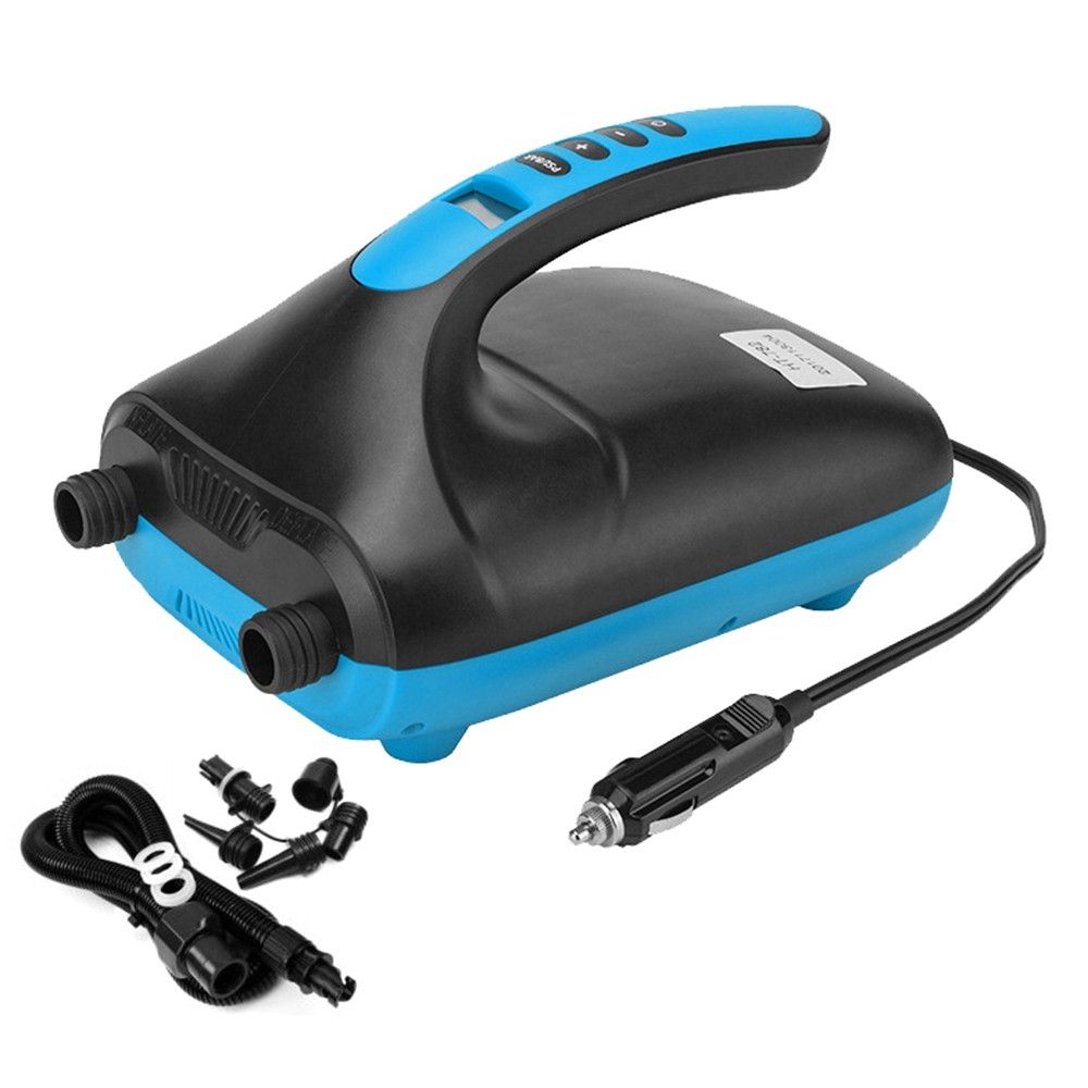 This automatic double stage intelligent 12V DC electric pump comes with a digital control and LCD screen to display the set pressure and real-time air pressure. The pump can auto stop at your pre-set air pressure.Easy to inflate and deflate for your demands.Comes with 6 nozzles to fit most air mattresses,inflatables boats,tent,stand up paddle boards etc.