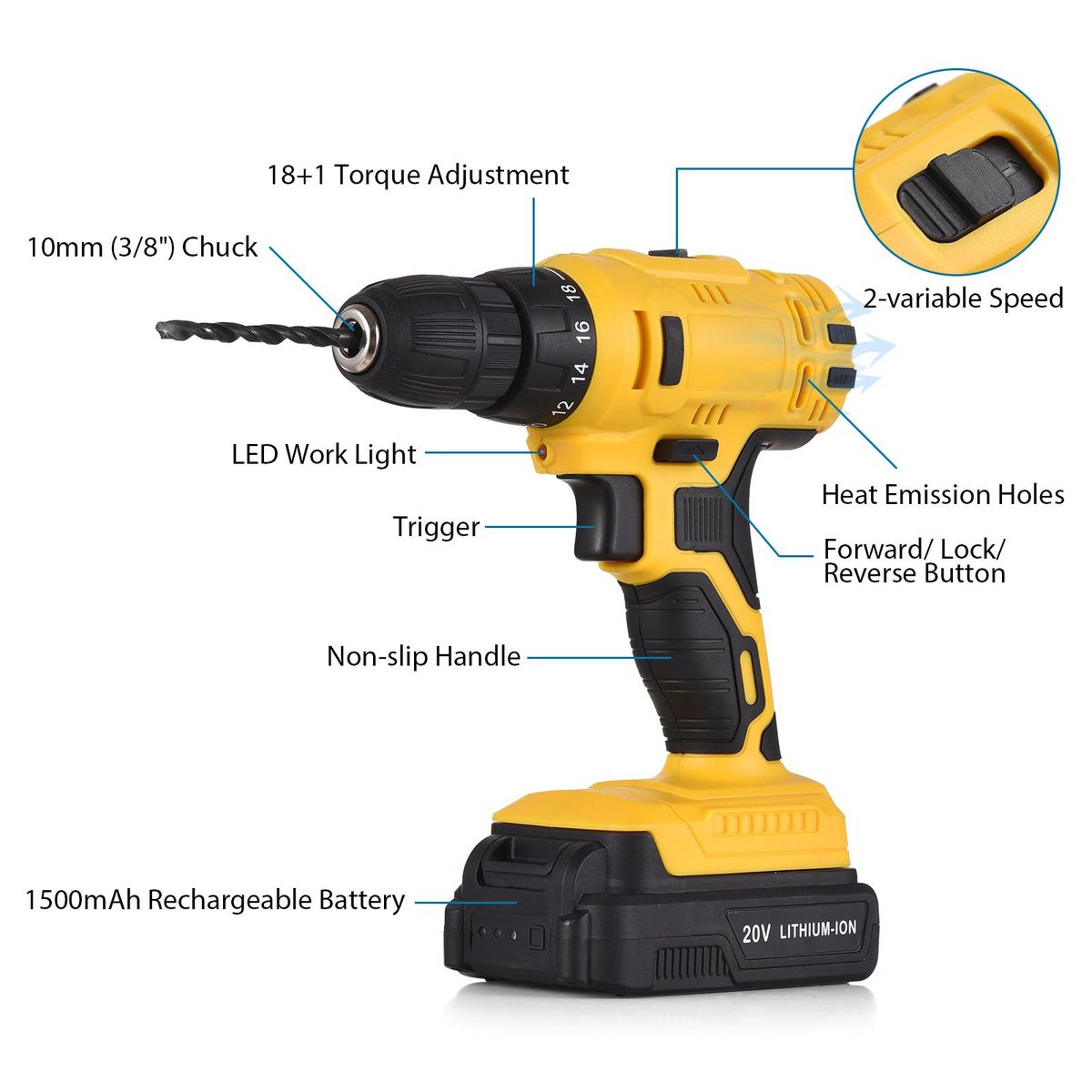 Buy 20V Portable Cordless Electric Drill 3/8 Inch Chuck Handheld Power Drill Screwdriver with 2 Batteries Fast Charger 42 PCS Drill Bits Extension Rod Clean Brush, LED Work Light 2-variable Speed 18+1 Torque Adjustment 28N.m in Nigeria