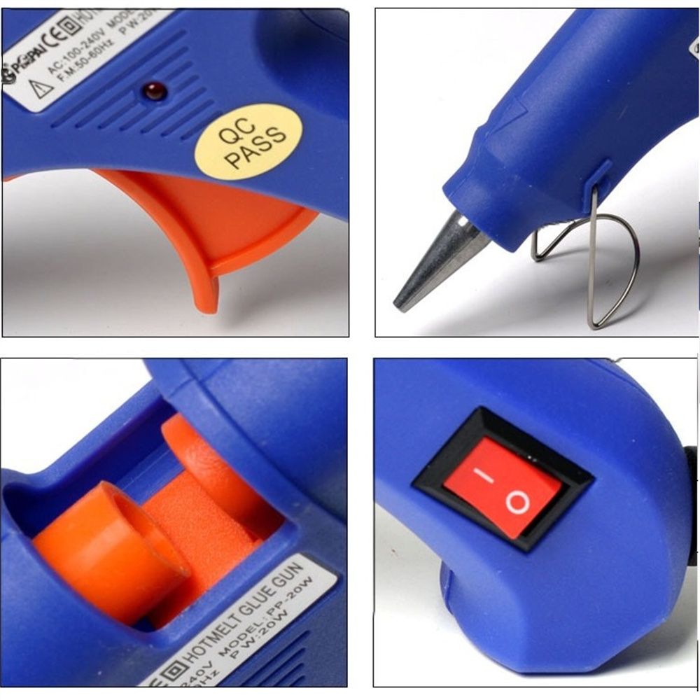 Description: Item Name:Blue 20W High Temperature Hot Melt Gun Voltage:110V~240V Power:20W Drill Hole: 7mm Features: and high quality Small size design and comfortable hand feeling,improving your work efficiency The heater component is made of PTC electric resistance Ultra-fast heating and automatic f control temperature Use normally in 100V to 240V power supply placing the fuse inside,use more safe The electricity strength is not to broke through of the product insulate while switch on electricity 1800Vs/minute It is used in the toy model, artificial flowers,the metals product,the wood product,card paper etc Package Include: 1× Blue 20W High Temperature Hot Melt Gun 10/50Pcs Sticks