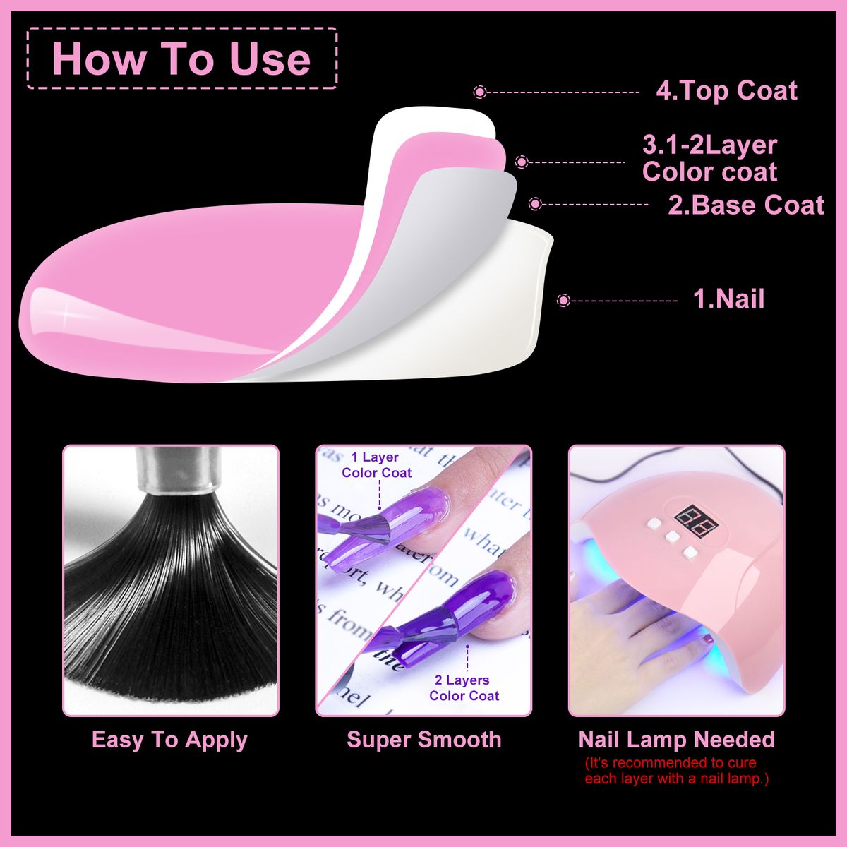 - Step 3. Apply Base coat first, which can make nail varnish lasting longer, cure with UV lamp or LED lamp. (Necessary)