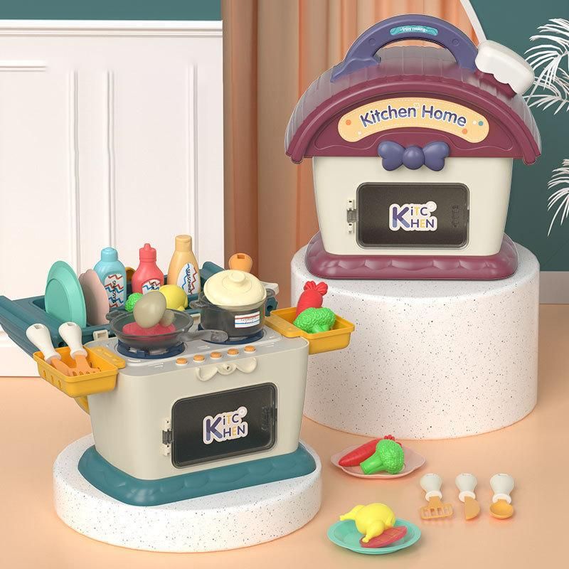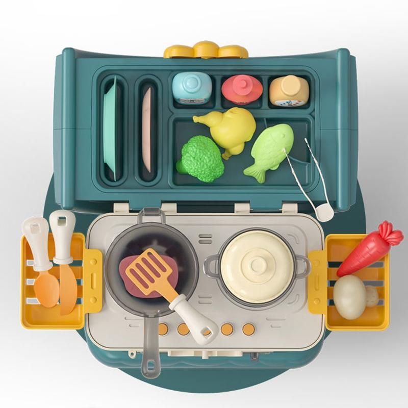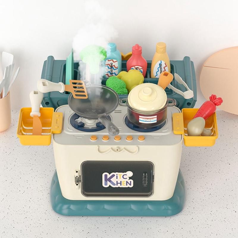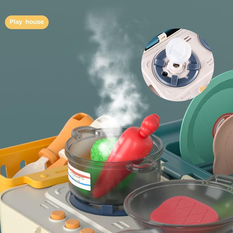 The play kitchen toy is horizontal, that it can be used by multiple children,a fun focal point for any kid's play day, including stovetop burners with lights, sounds, and sprays, kitchen toy sinks with tap water, simulated ovens and refrigerators,pretend food like eggs, fish, crab, and fruit,good Shelves and other Kitchen Accessories toys