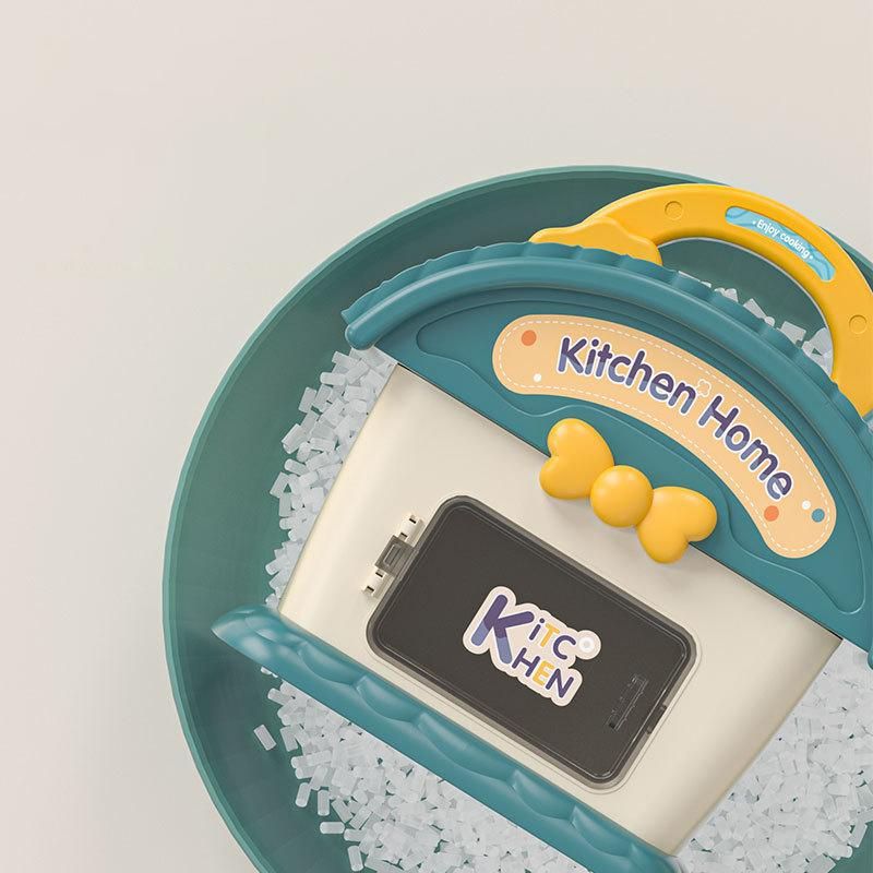 Starting a restaurant game. Children can play with the simulated ice cream toy taken out of the refrigerator before cooking. Stove and microwave are listened to the food starting to foam and the spray appears to fizz! They flip the eggs in the frying pan like a good cook,The fish and crabs started to change color in the pot. After cooking, the children can wash the dishes in the sink, and then built-in shelves.