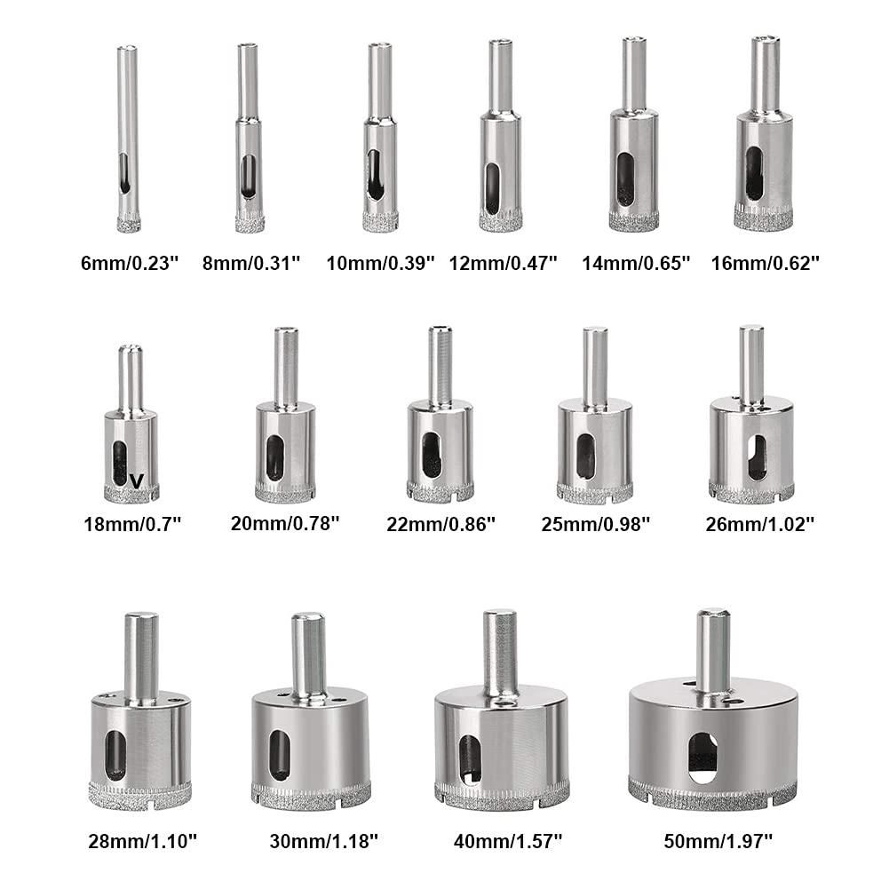 15 Sizes Diamond Hole Saw: 6mm, 8mm, 10mm, 12mm, 14mm, 16mm, 18mm, 20mm, 22mm, 25mm, 26mm, 28mm, 30mm, 40mm, 50mm. Diameter of Triple-cornered bit: 6mm, 8mm, 10mm, 12mm. Hole saw set include 15 holes saw drill bits + 4 Triple-cornered bit+1 hole saw guide clamp+1 screwdriver. Buy as a set and save over 80 percent.