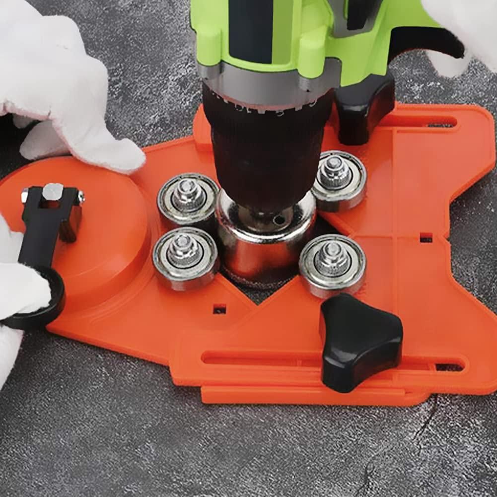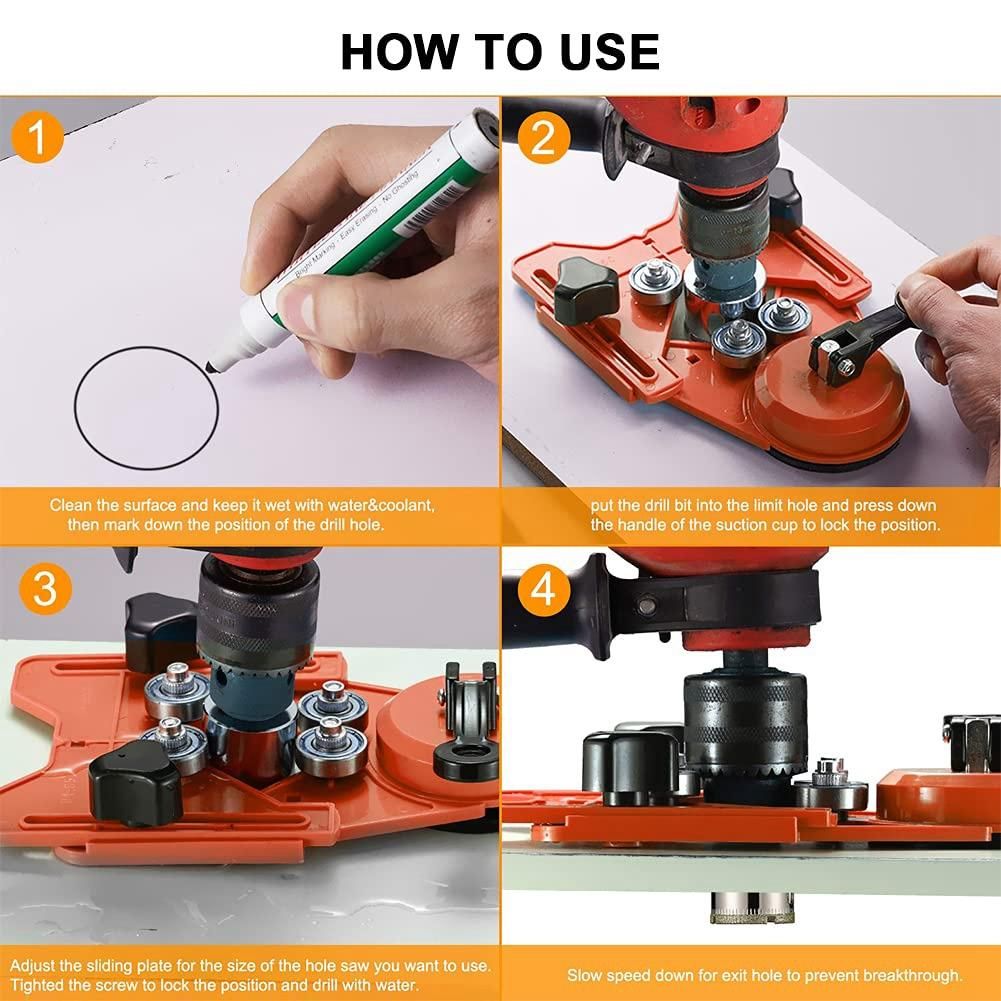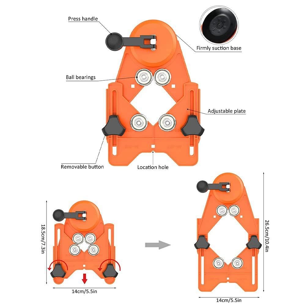 Hole Saw Guide: No need to worry about scratching your tile when drilling the hole. Our Adjustable hole saw drilling guide fixture with suction cup. The maximum opening length of the plate is 3-1/4 inch, which is large enough to fit all sizes of adjustable hole saws. The guide plate has 4 removable ball bearing, you can choose 2 modes (fixed 3 or 4 bearings), just flip the plate.