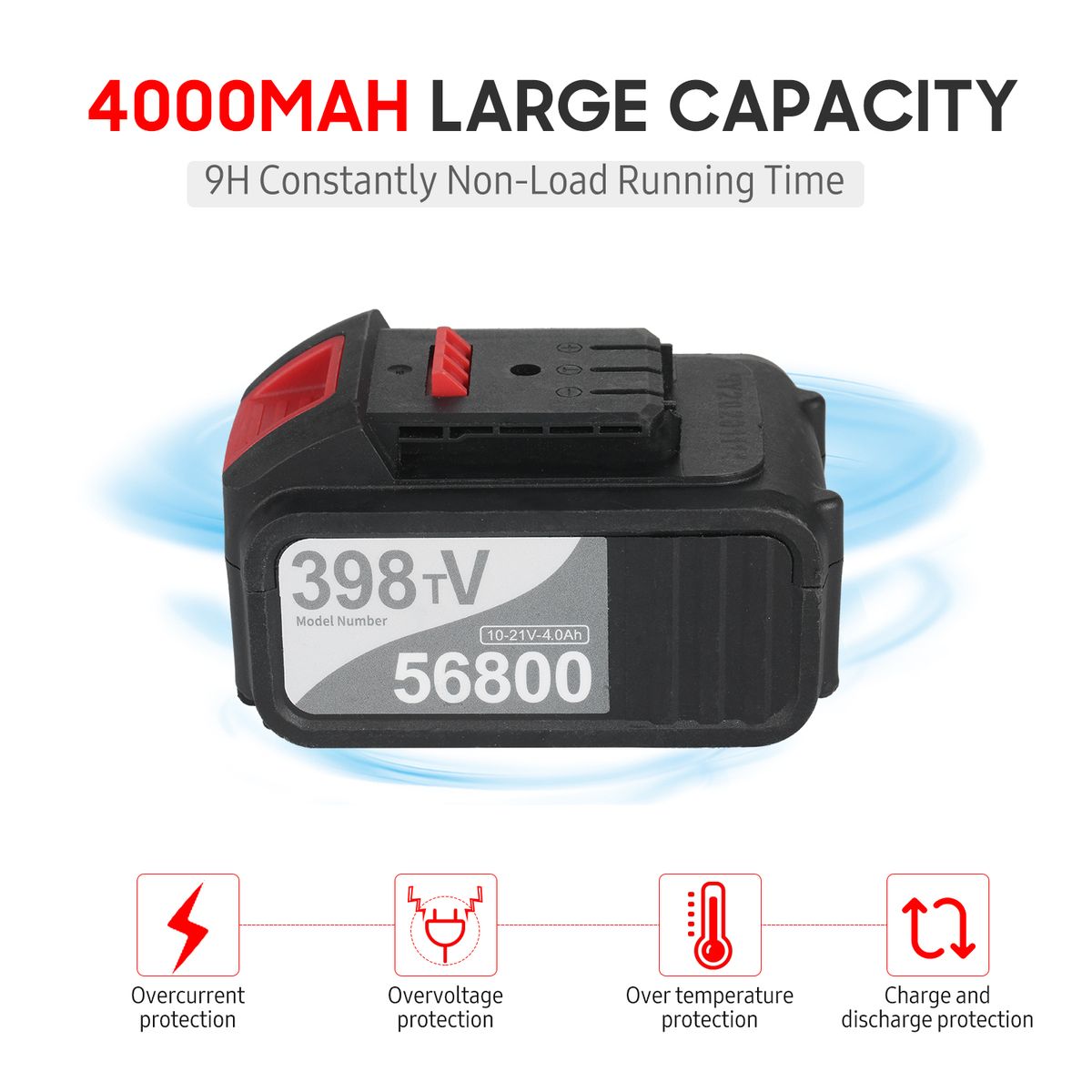 Large Batterry Capacity amp; Depth Gauge --- 398TV 21V 4.0Ah Lithium battery using time can up to 180 min under no load rotation. With 19.5cm(7.7 inch) metal depth gauge lasts a longer service life, offering greater control, precision.