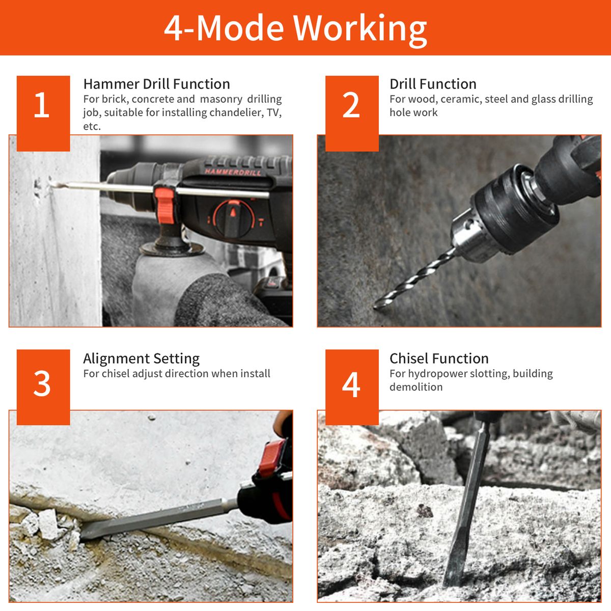 4-Mode Select --- This rotary hammer drill includes drill, hammer drill, chisel and chisel alignment settings 4 functions in 1 tool, money saving, time saving and increasing efficiency.