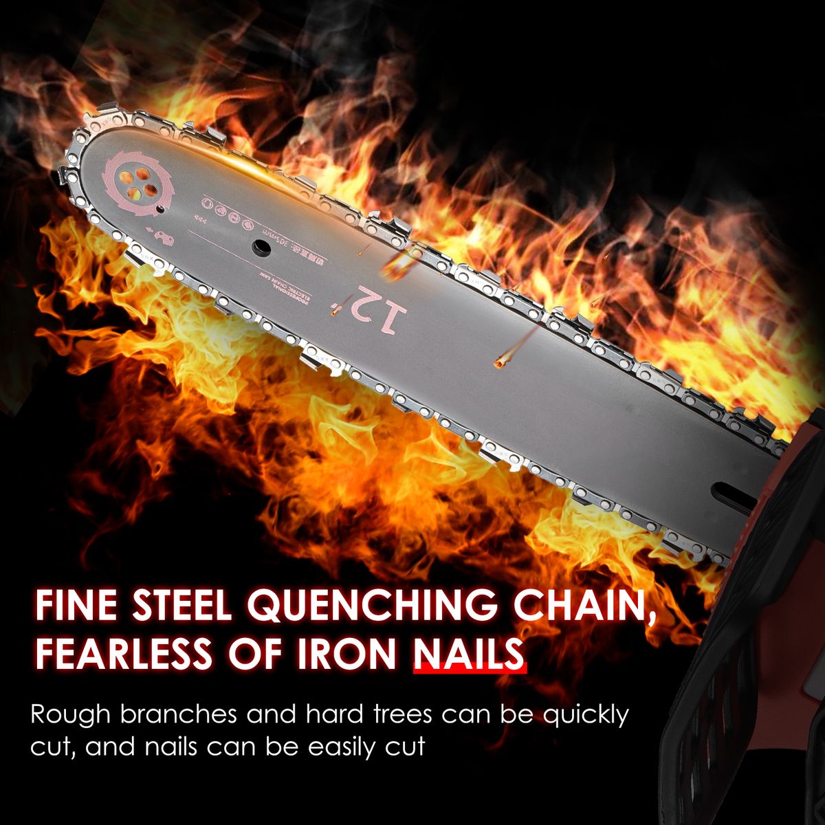 Safe Operation, Wide Use -- The 12-inch chainsaw has a smart safety lock and a trigger, you need to press them simultaneously to start the chainsaw. This electric chainsaw is great for all kinds of gardens, parks, farms, large pastures, orchards, greenhouses, in which you can cut branches, grapes, cherry trees and so on.