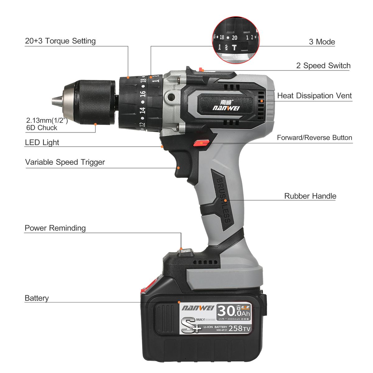 【20+3 Torque Setting amp; 2 Variable Speed】20+3torque settings, 2 speeds(0-550RPM/0-2150RPM) adjustment, variable speed trigger and forward/reverse switch provide favorable force and precise control for driving in/out screws to prevent stripping, and drilling into wood, plastics, ice, metal and colorsteel with ease. Low torque with first speeds for screws driving and wood drilling. High torque with second speeds for wall drilling and hammer functions.