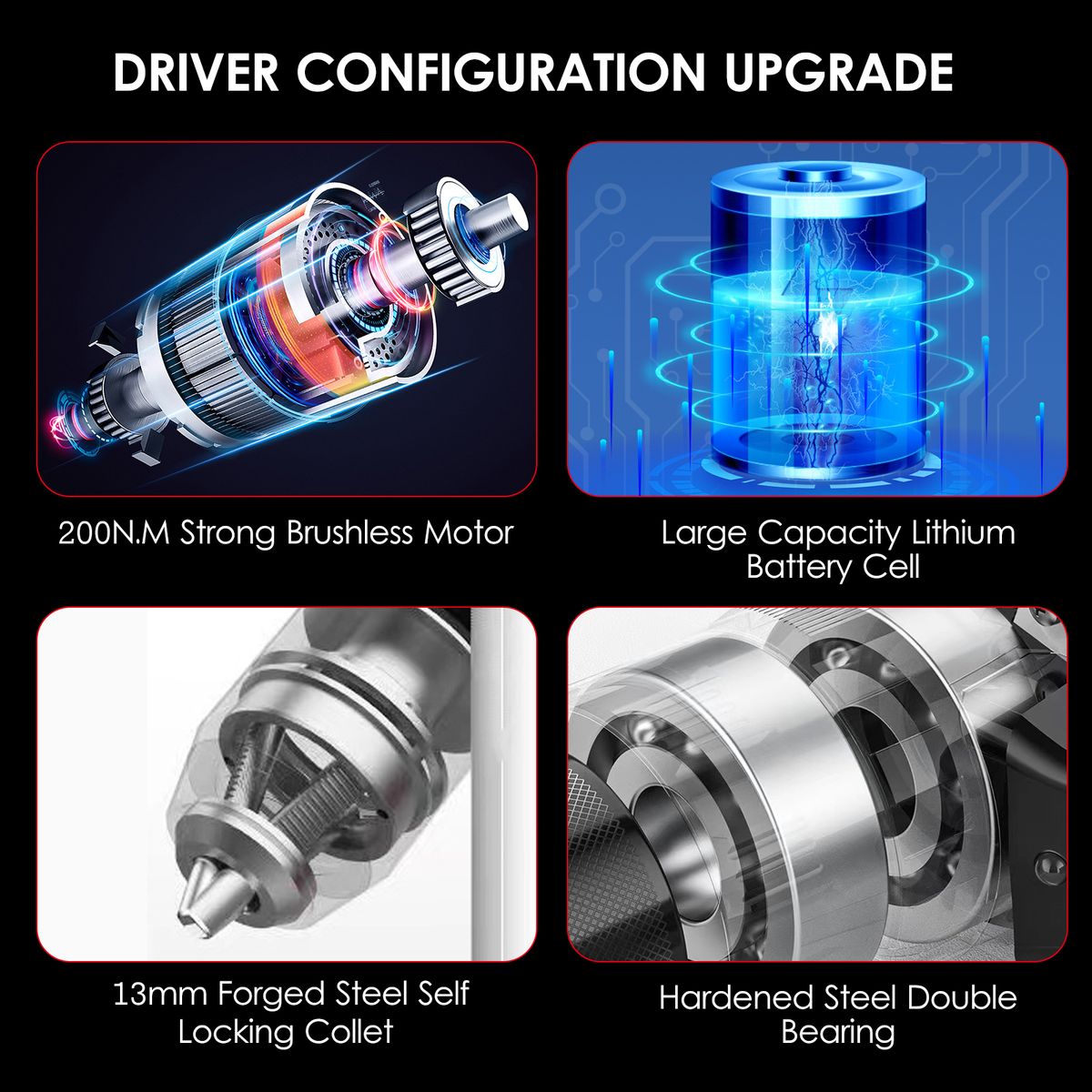 【Powerful Brushless Drill】 High performance brushless motor optimizes machine\'s efficiency, increases 10X motor life and 50% more runtime of per charge when compared to brushed motor. Maximum 200Nm (2,655 in-lb) torque 10X more torque than the vast majority of drill driver in the market, easily fulfills your needs for processing a wide range of materials from screwing to metal or wood drilling and hole opening.In addition, brushless drills generate no friction or heat during use, and perform better and more smoothly.