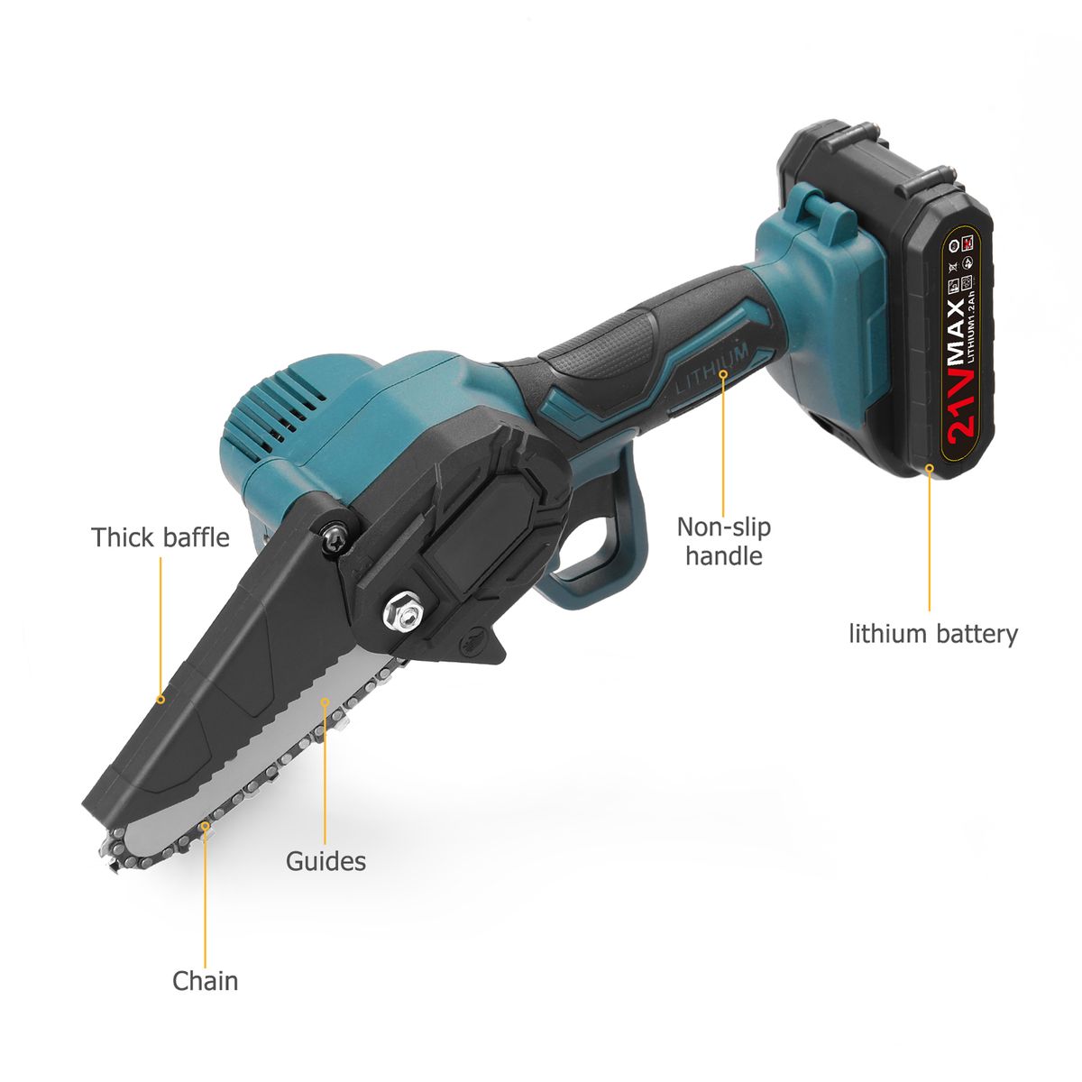 Compare with other type of chainsaw, this chainsaw is smaller and light, so you can hold and use it more easily, which can be used for more people.Ergonomic handle design, one hand use, long time griping will not tired hands.Cordless design, lightweight and portable, easy to carry out and saws the wood.The chainsaw has been deep quenching by high temperature, with sharping chainsaw, more wear-resistant, smooth cutting.With high working efficiency, high positioning accuracy, low noise, which can give you a nice using experience.