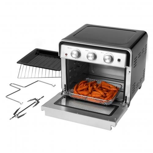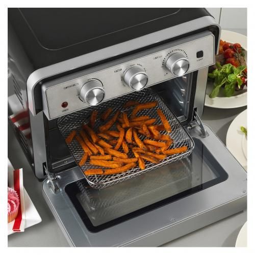 - Bake, grill, toast and air fry- Rapid hot air circulation- Includes air fryer basket, bake pan, wire rack, 10" pizza pan, crumb tray and timer- 1700W power7 cooking function60 miuntes timer with saty On functionAdjustable toasting controlAdjustable thermostatRapid Hot Air circulation air fryer technologylarge 23L oven capacitylarge viewing window
