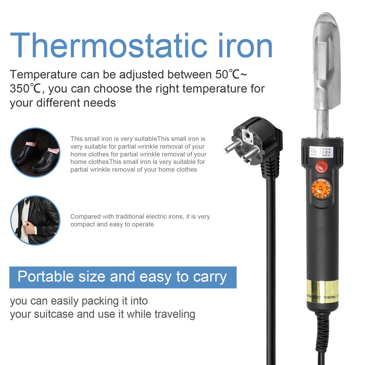 This small iron is very suitable for partial wrinkle removal of your home leather clothes. Compared with traditional electric irons, it is very compact and easy to operate. The temperature can be adjusted for your different needs, come on and enjoy this practical tools, it will not let you down.