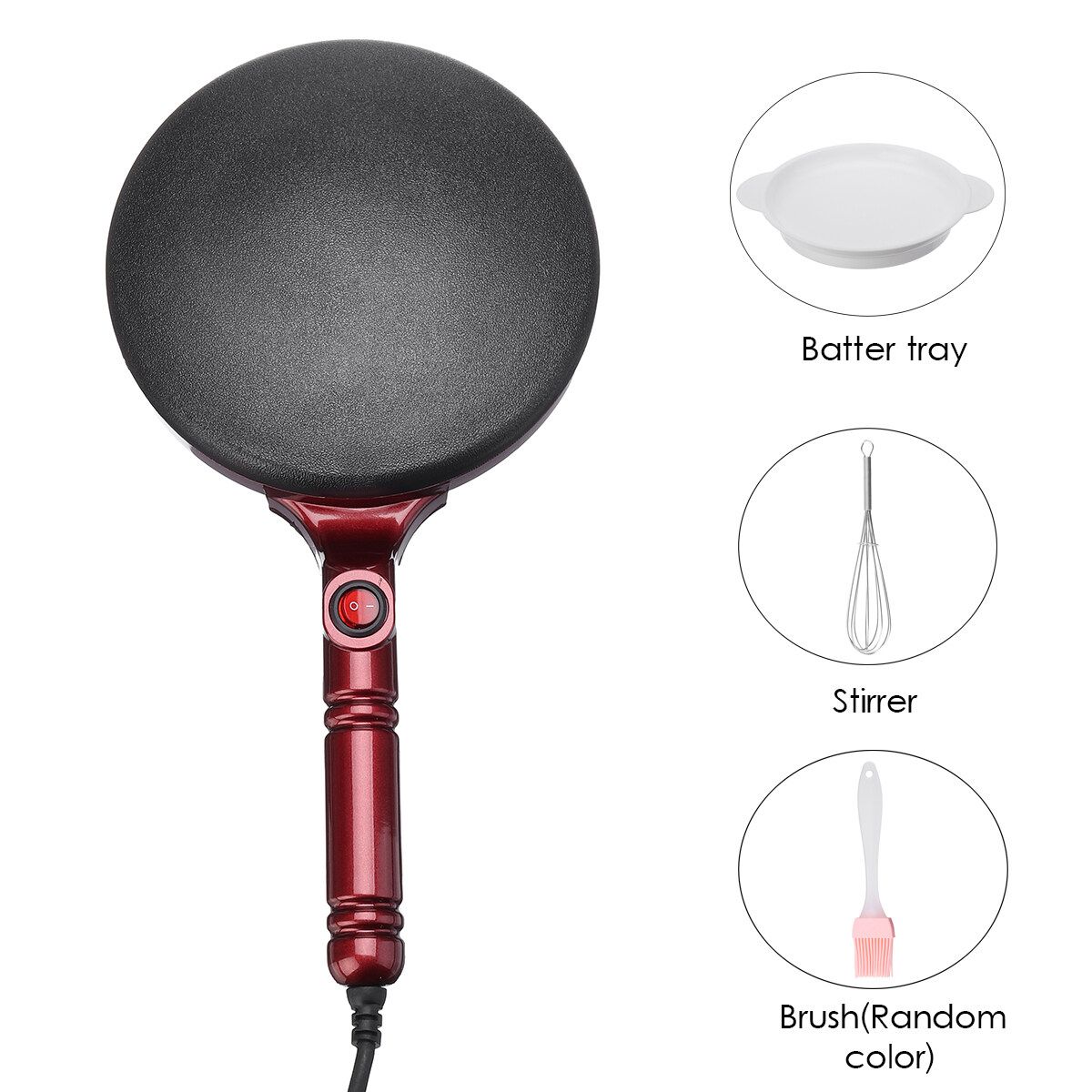 1 x Crepe Maker 1 x Tray 1 x Whisk 1 x Brush (excluding decorations)