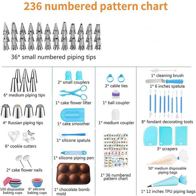 236 numbered Pattern Chart:36*small numbered piping tips6*medium piping tips4*russian piping tips6*cookie cutters2*cake flowers nails100*disposable baking cups6*silcone baking cups2*small couplers1*cake flower lifter1*cake smoother1*silicone spatual1*silicone piping pen1*chocolate mold2*cable ties1*ball coupler1*medium coupler1*36 numbered pattern chart 1*cleaning brush1*6 inches spatula 8*fondant decorating tools3*scrapers50*medium disposable piping bags1*12 inches TPU piping bags