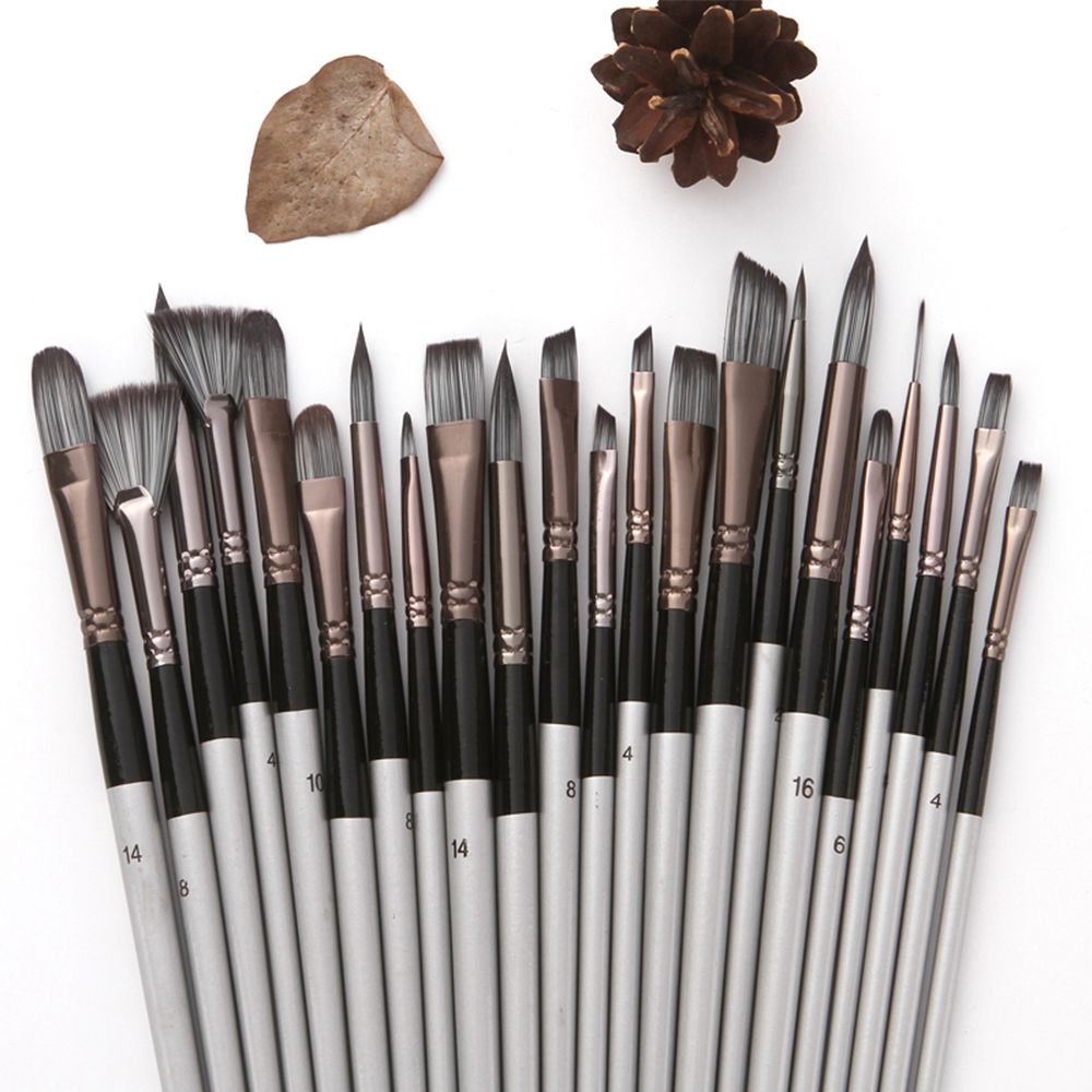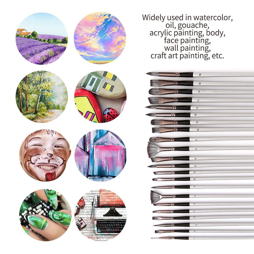 【Multipurpose Use】: 23pcs different shape and size of paint brushes, which can meet different painting needs, including Round Tips(2#,4#,8#,10#,12#,16#); Flat Tips(2#,4#,10#,14#); Filbert Tips(4#,6#,8#,10#,14#); Angle Tips(4#,6#,8#,14#); Fan Tips(4#,8#); Liner Tips(1#); 1-Inch Brush(1 quot;).