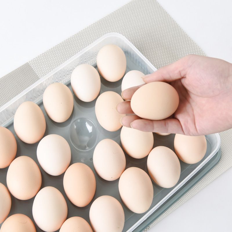 SPACE SAVING EGG CONTAINER FOR YOUR KITCHENThis large-capacity egg storage container consisting of 24 compartments of egg nests. So, there is no need to worry about eggs taking up extra space. With a transparent design, (top and bottom), the number of eggs in the box is clear at a glance.