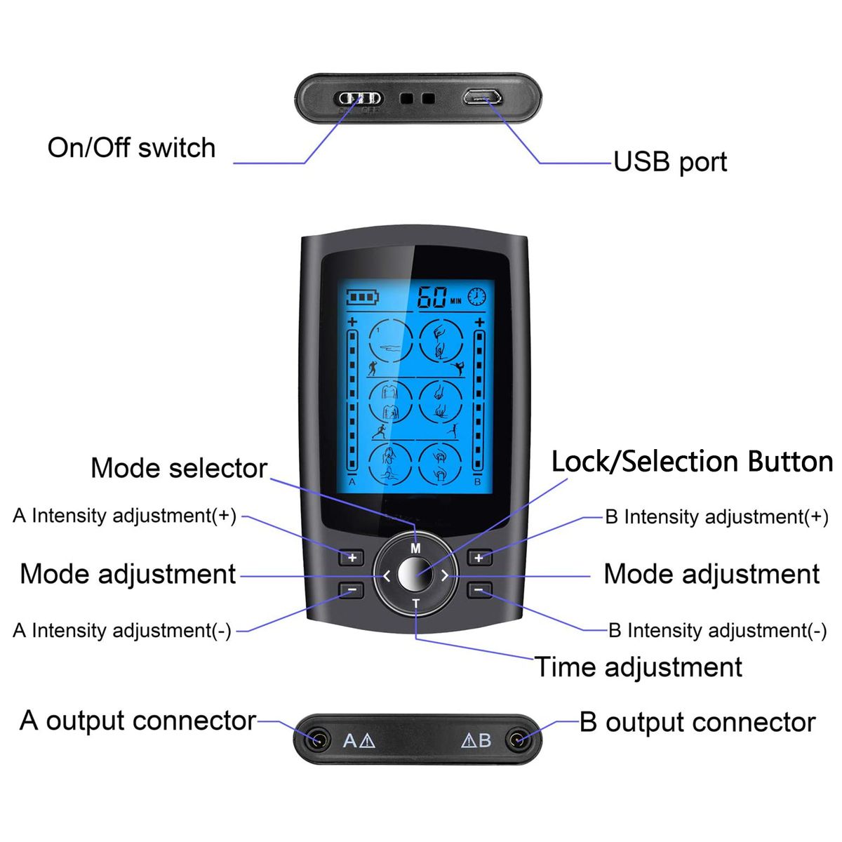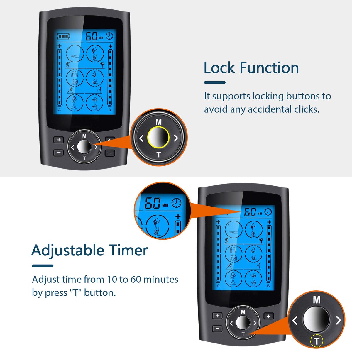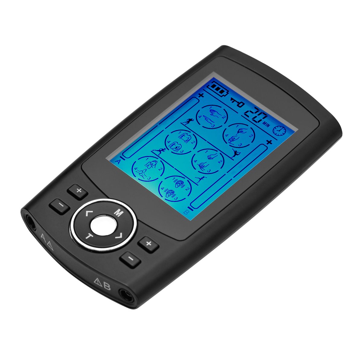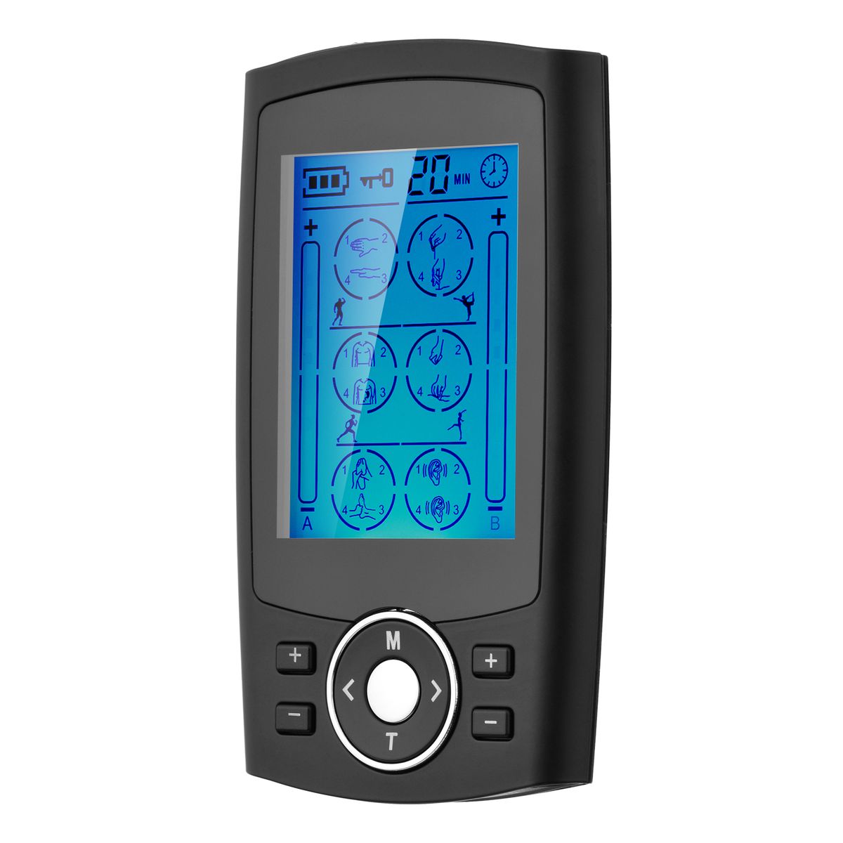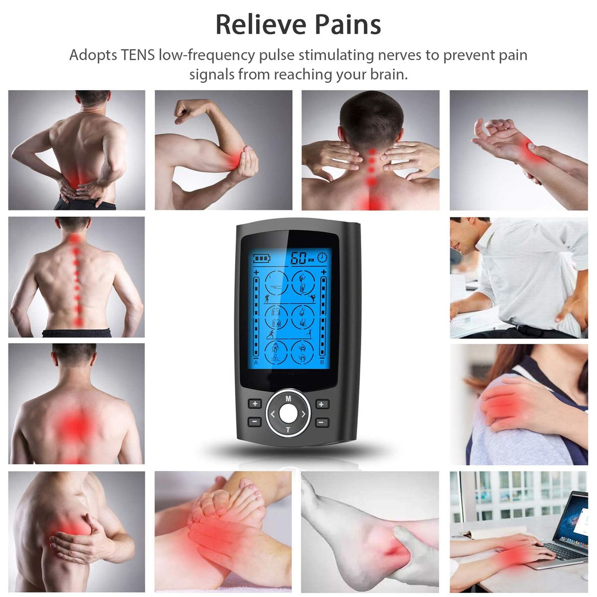 1.Dual-Channel TENS Device. Adopt TENS low-frequency pulse techniques to relieve pains. And with independent dual-channel output, it allows use by 2 person or in different areas and of different modes and intensity in channel A and B.