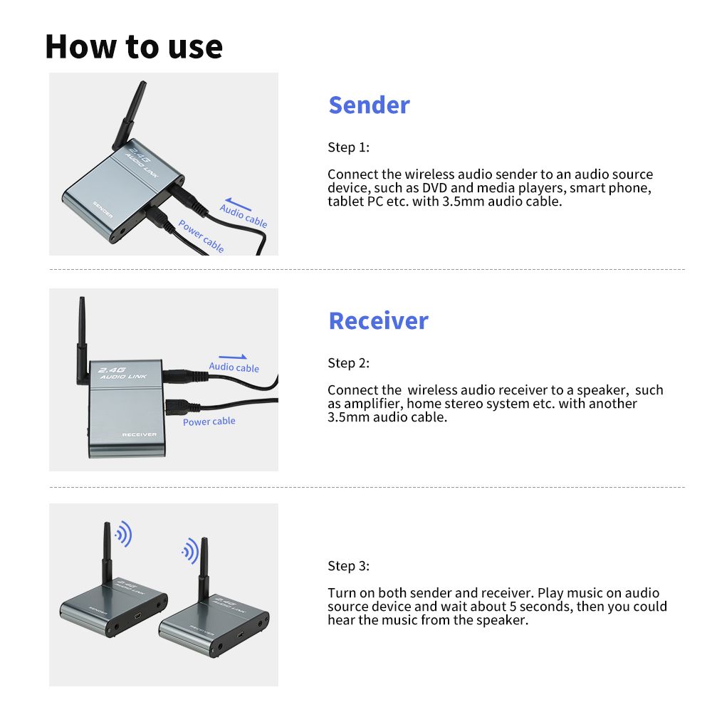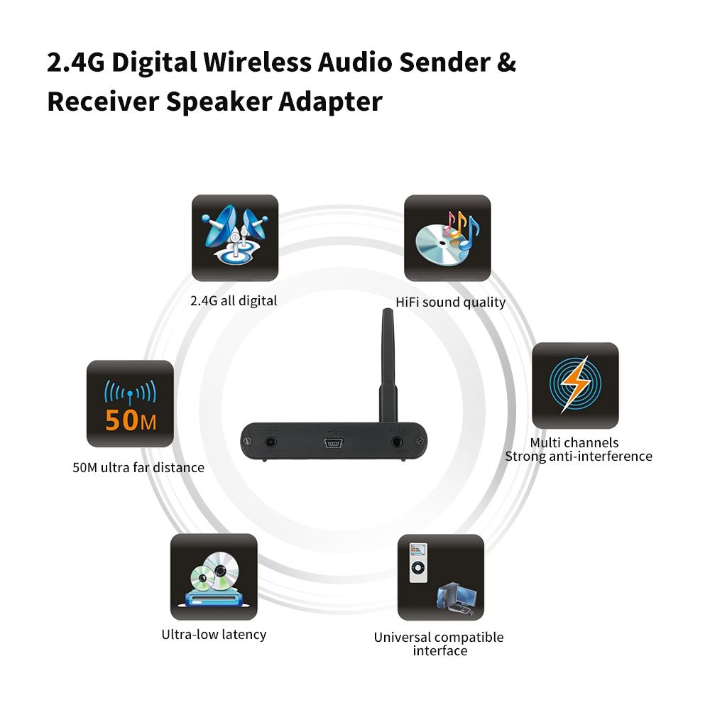 Lower signal delay, adopt ultra-low latency real-time digital encoding technology, which maximizes wireless signal transmission speed, enjoying latest movie, video, TV play and more with 360 deg;immersive sound in perfect audio video synchronization. 44.1kHz, 16Bit sampling rate and 2Mbps transmission rate protect signal from attenuating during wireless transferring process, instantly gain high fidelity sound through receiver box.