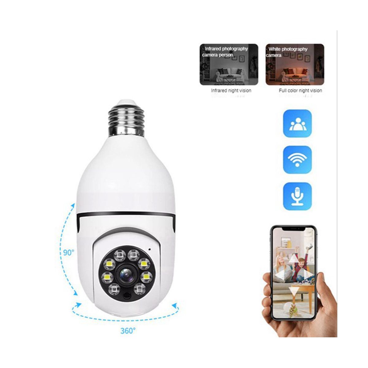 [1080P & Color Night Vision]The security light bulb with camera is equipped with 4 IR and 4 white , which can capture 1080P HD images within 33 feet. Night vision mode supports IR-CUT automatic switching, normal night vision, and color night vision, free to and camera light bulb adds anti-flicker and 3D-DNR. Record HD video even at night.