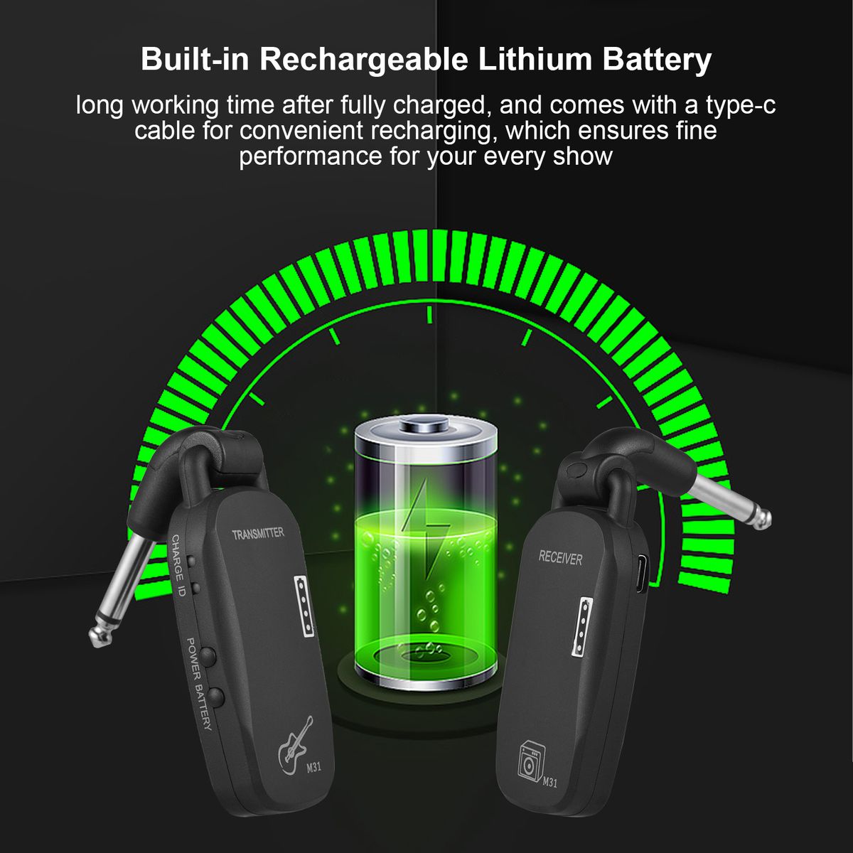 2.4G wireless guitar system with rechargeable transmitter and receiver, is available for most electric musical instruments, such as electric guitars, bass, electric-acoustic guitars, etc.