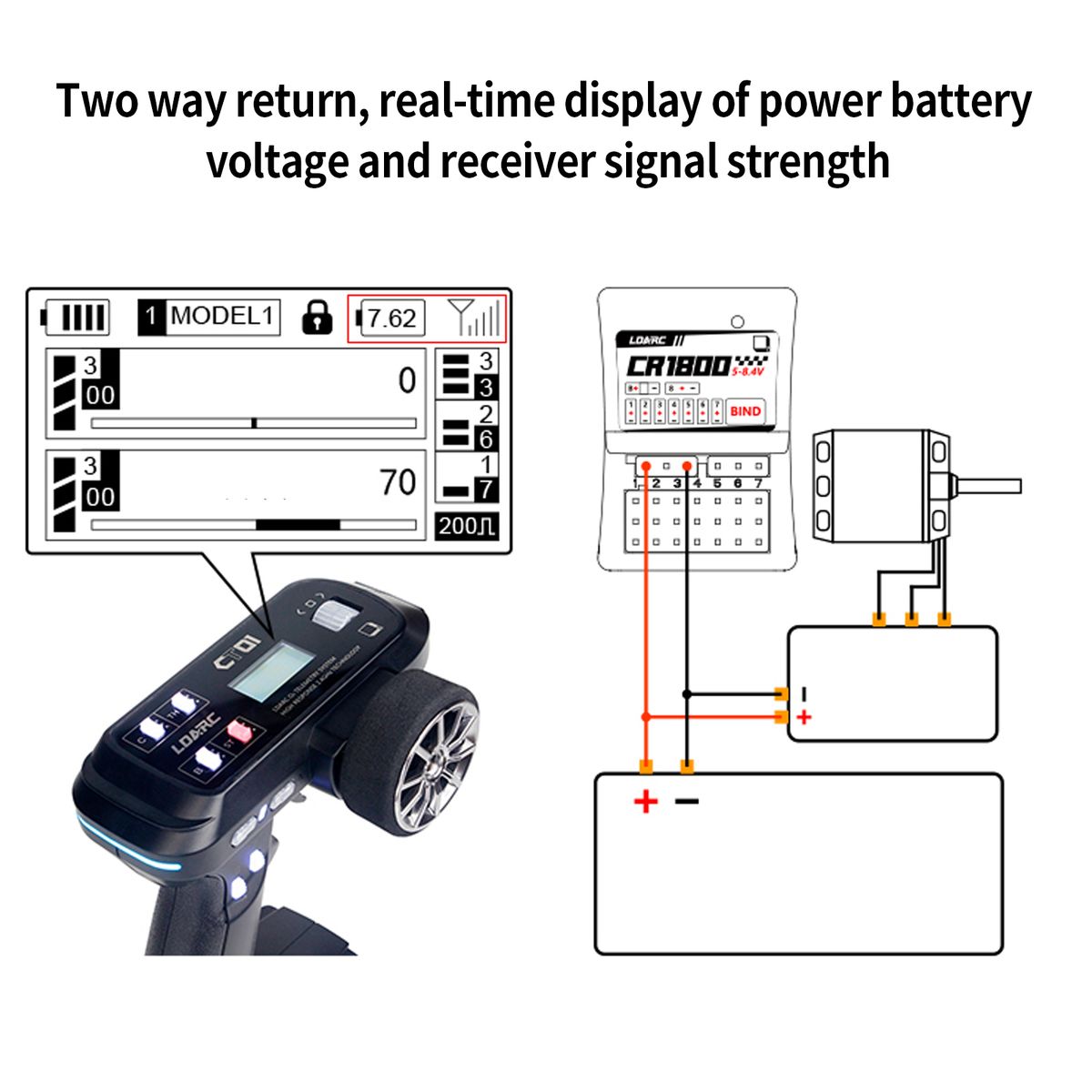 Two way return, real-time display of battery voltage and receiver signal strength.