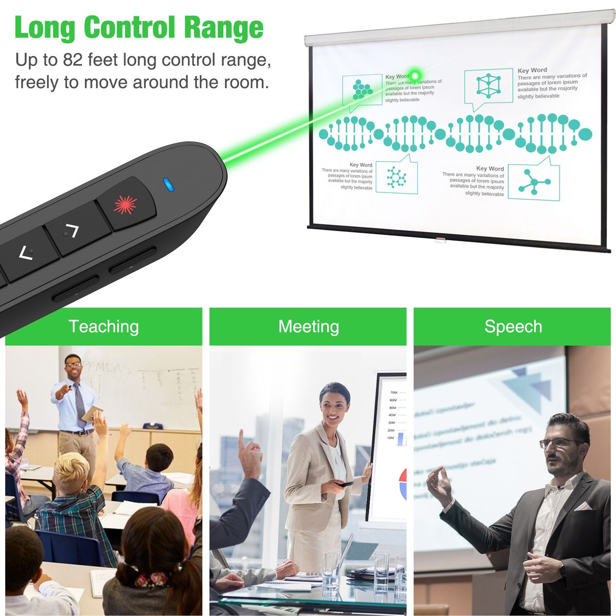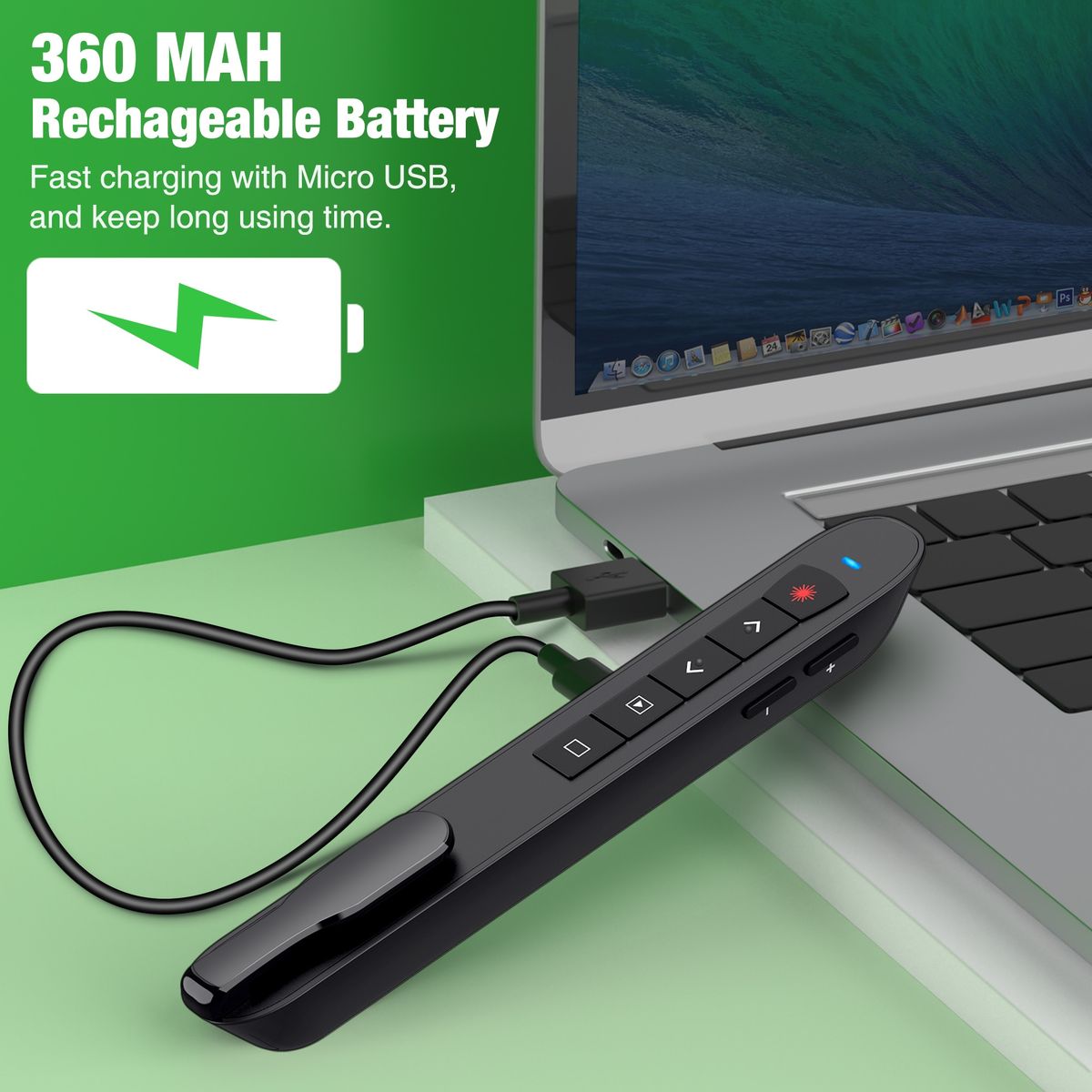 2.4GHz Wireless Presenter With Green Laser Pointer Rechargeable Presentation Clicker USB RF Remote Control Pen For PowerPointFeature:【Presentation Clicker/Cat Toy with Bright Green Light】10 times brighter than a red light, bright green laser pointer that is easy to see against most background, highlight key areas of your slides, brilliant green light laser pointer helps you get their attention—and keep it. The Presentation Remote With Green pointer laser is very bright, as a toy is ideal to play with your cats and dogs!【Multi-features Rechargeable Presentation Remote】For PowerPoint remote supports various functions: hypeink, volume control, switch windows, full/black screen, page up/down. With built-in 360mAh rechargeable lithium battery, the wireless presenter can work up to 7 days after charging 1 hour. A battery power indicator ensures you finish your presentation.【Wireless Clicker with 82ft Wireless Control Range】Wireless remote control distance range of up to 82-foot, so you can free to move around the room and communicate with your audience, helps you make ordinary presentations extraordinary. The Green light can reach 330 ft range, suitable for classroom, meeting room, school hall, church etc.【Plug & Play PowerPoint Clicker】No need any drivers, just plug the usb dongle into a usb port, compatible with Windows 7 or later, Mac OS 10.10 or later, Linux,Android 4.3 or later,supports for PowerPoint, Keynote, Prezi and etc. For Mac users, follow a simple set-up for identify the presenter【Clip Design & What You Get】 Apart from features intuitive touch-keys for easy slideshow control, the clip design allows you attach it to your book or pocket, No need to worry losing your Presentation Clicker anymore! Package list:1x Presenter Remote, 1x Pouch Case, 1x User Manual,1x USB Cable.