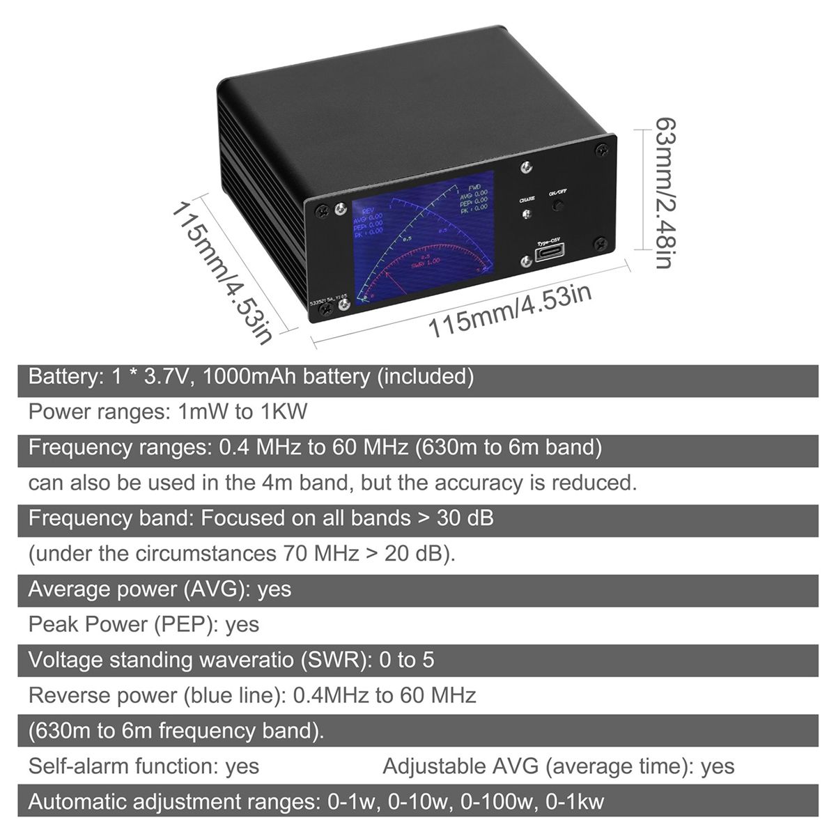 It can measure instantaneous power average power peakpower with power measuring ranges from 1mW to 1kW Frequency ranges of 04 MHz to 60 MHz 630m to 6m band can also be used in the 4m band but with reduced accuracy