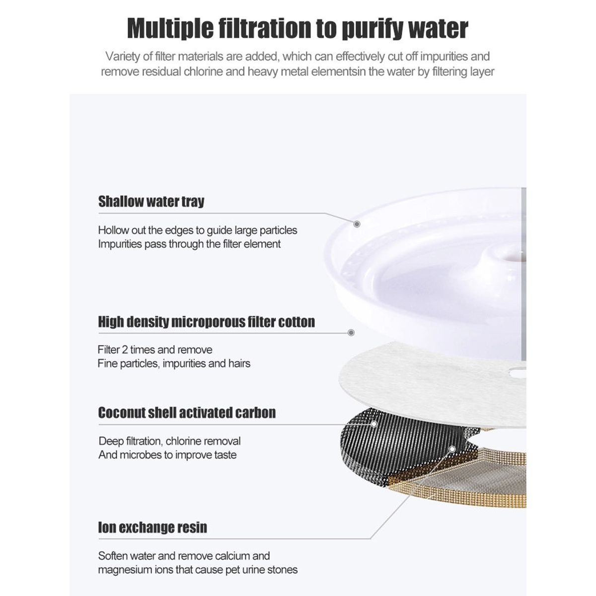 [Activated Carbon Filter]The cat water dispenser includes a carbon water filter. It not only filters hair, impurities but also eliminates odor, softens hard water to improve the taste.