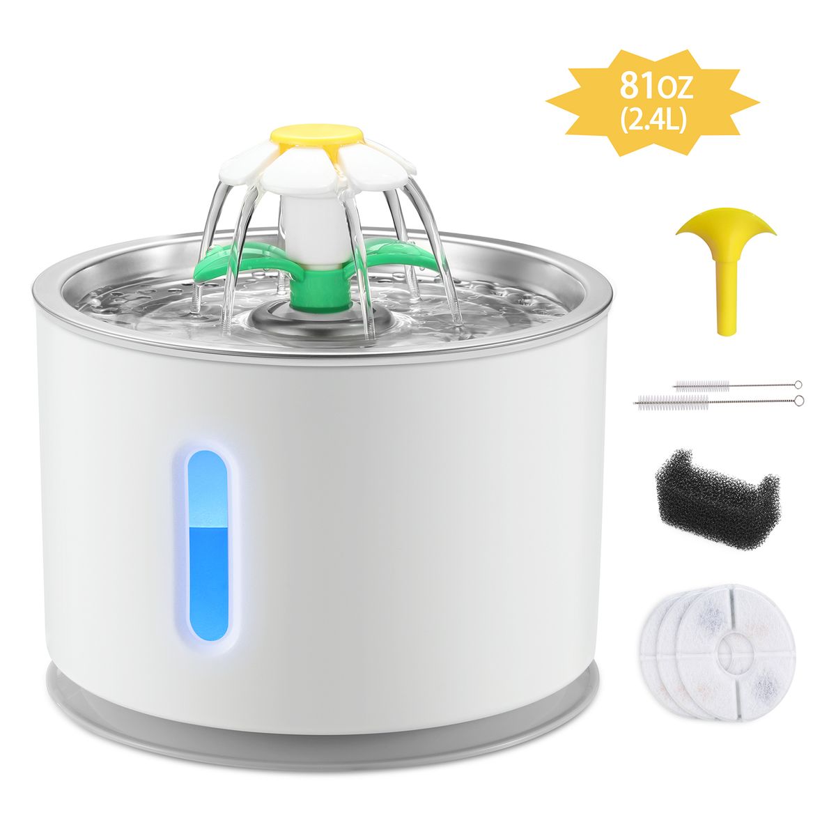 Smart pump - The state of the art pump is ultra-quiet and it has low-energy consumption. In addition, the pump turns off automatically when the fountain runs dry.The LED light alerts you when your pet needs more water and it also can attract your pet's attention to drink water.