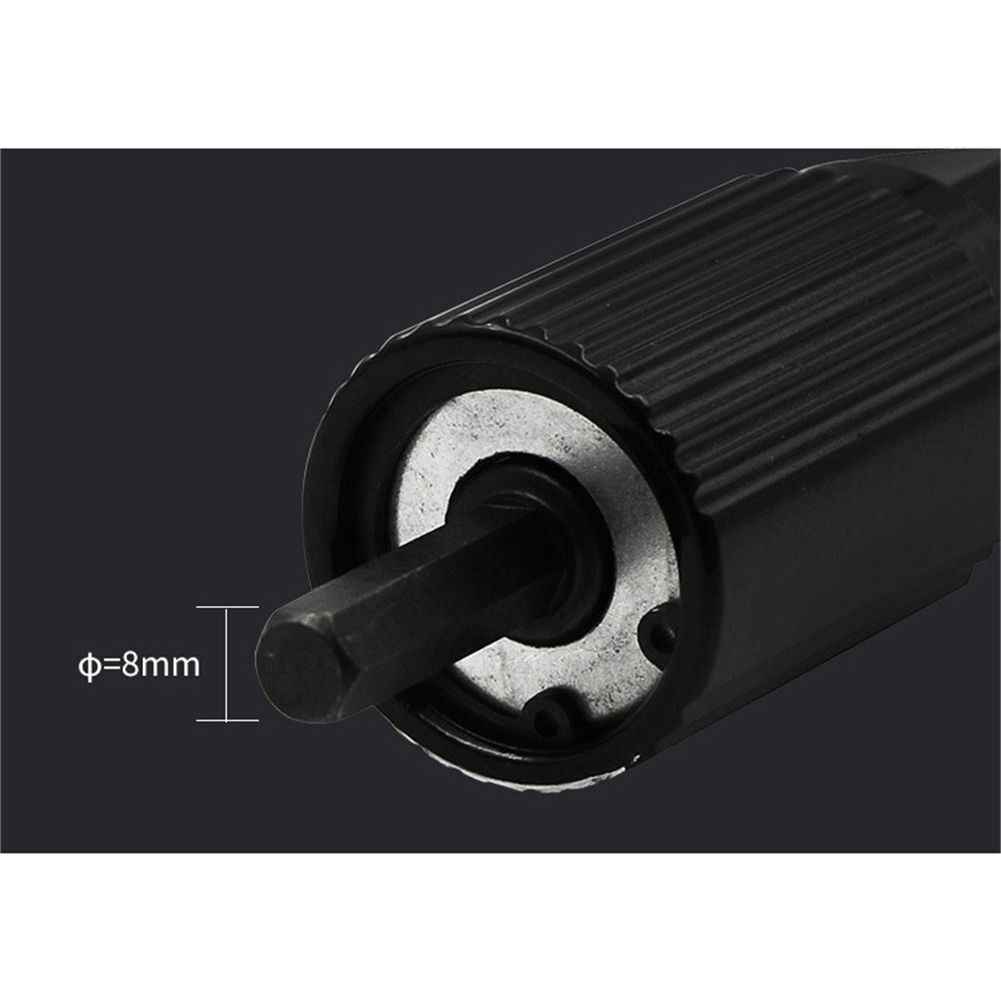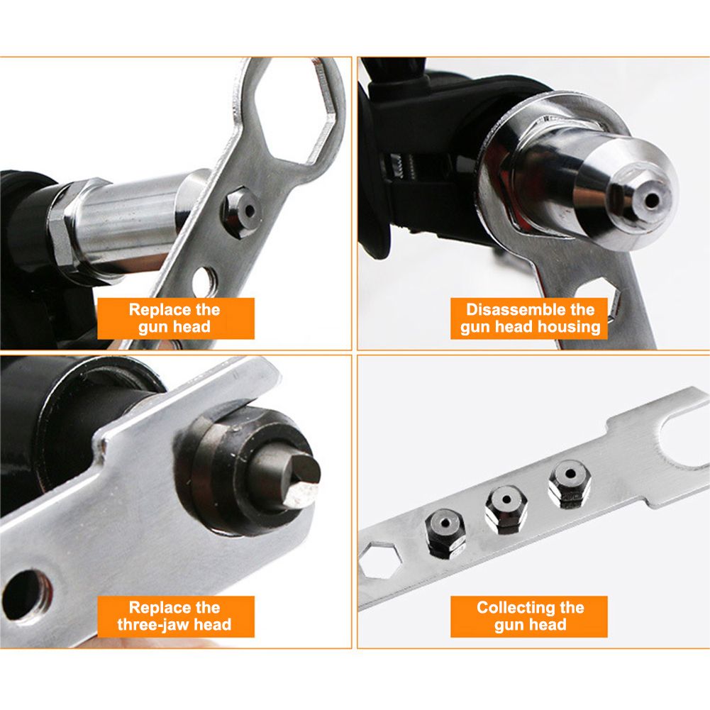 1. Alloy steel forged head, high hardne, good toughne, no rust, durable. 2. High-hardne hexagonal connecting rods for stable clamping and can be used for lithium drills, torsion drills and drills. 3. Unique design, from fine to thick, small air resistance, easier to use, saves time and effort. 4. The handle is held vertically, made of hard plastic, with a non-slip texture design that is not slippery. 5. 360 degree grang nail design, nail three-jaw anastomosis, three-piece structure, difficult to staple. Specification: Color:Black Weight:459g Quantity:1pc Material:Metal Wrench length:149mm Handle Size:123*26mm Rivet adapter:143*35mm Chuck length:30mm Package includes: 1* Riveter Adaptor 1* handle 1* wrench 4* rivet head