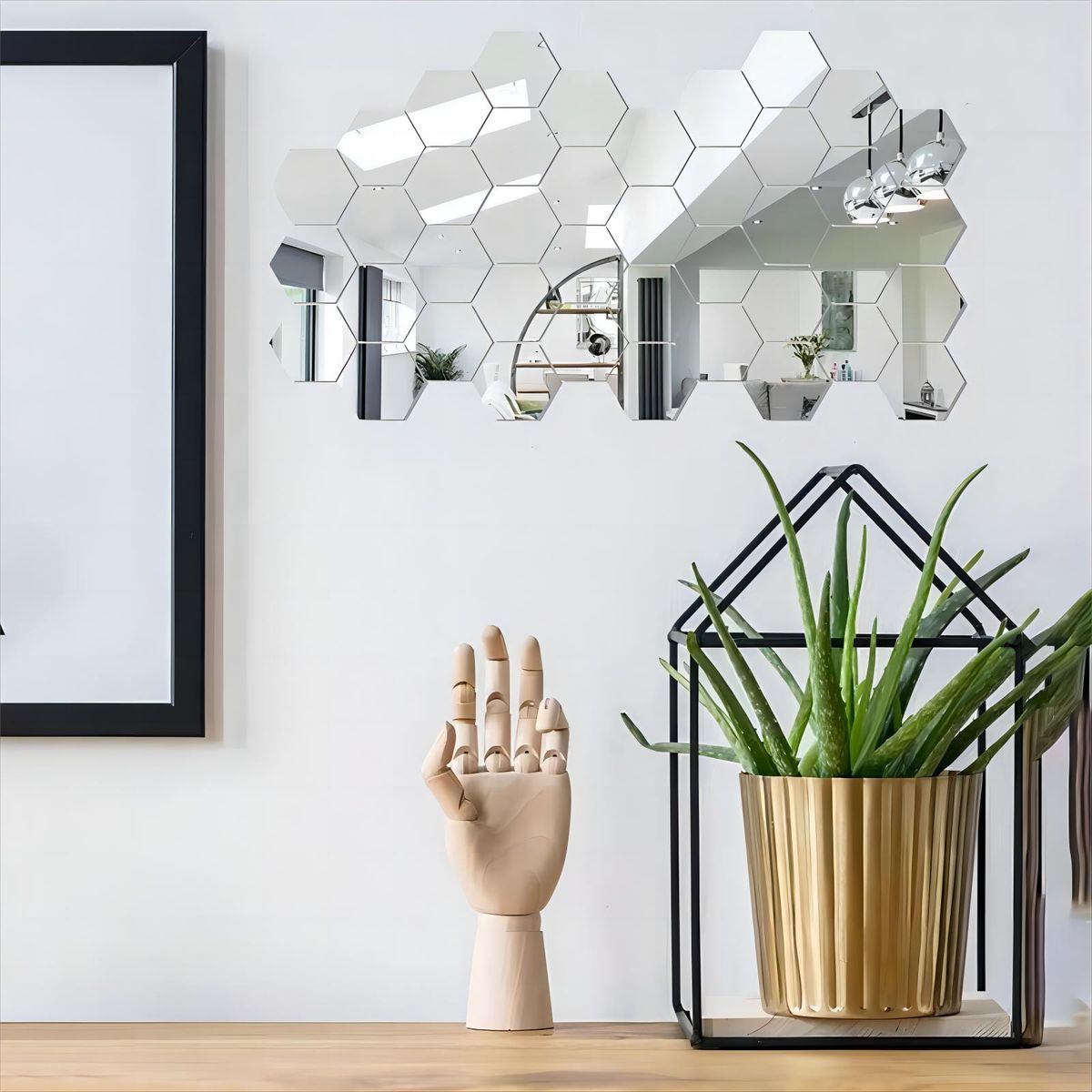 Available in silver and gold colors to match any decor scheme, the hexagons can be arranged into different geometric shapes and patterns to customize your space. Stick them on the living room, bedroom, bathroom, or kitchen walls to reflect light and create the illusion of a larger, brighter room.