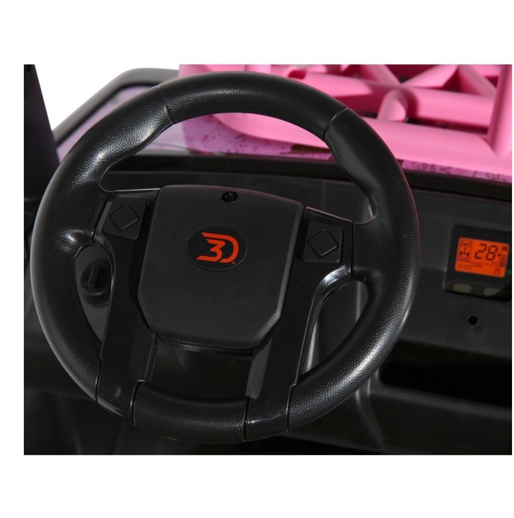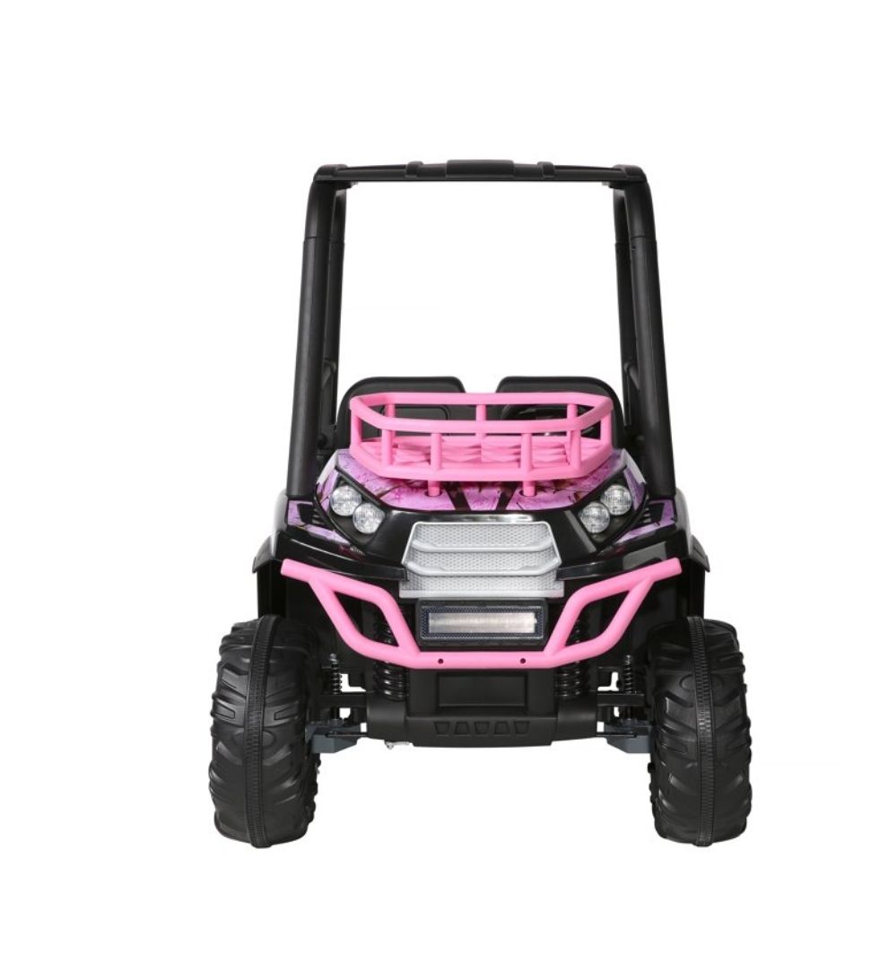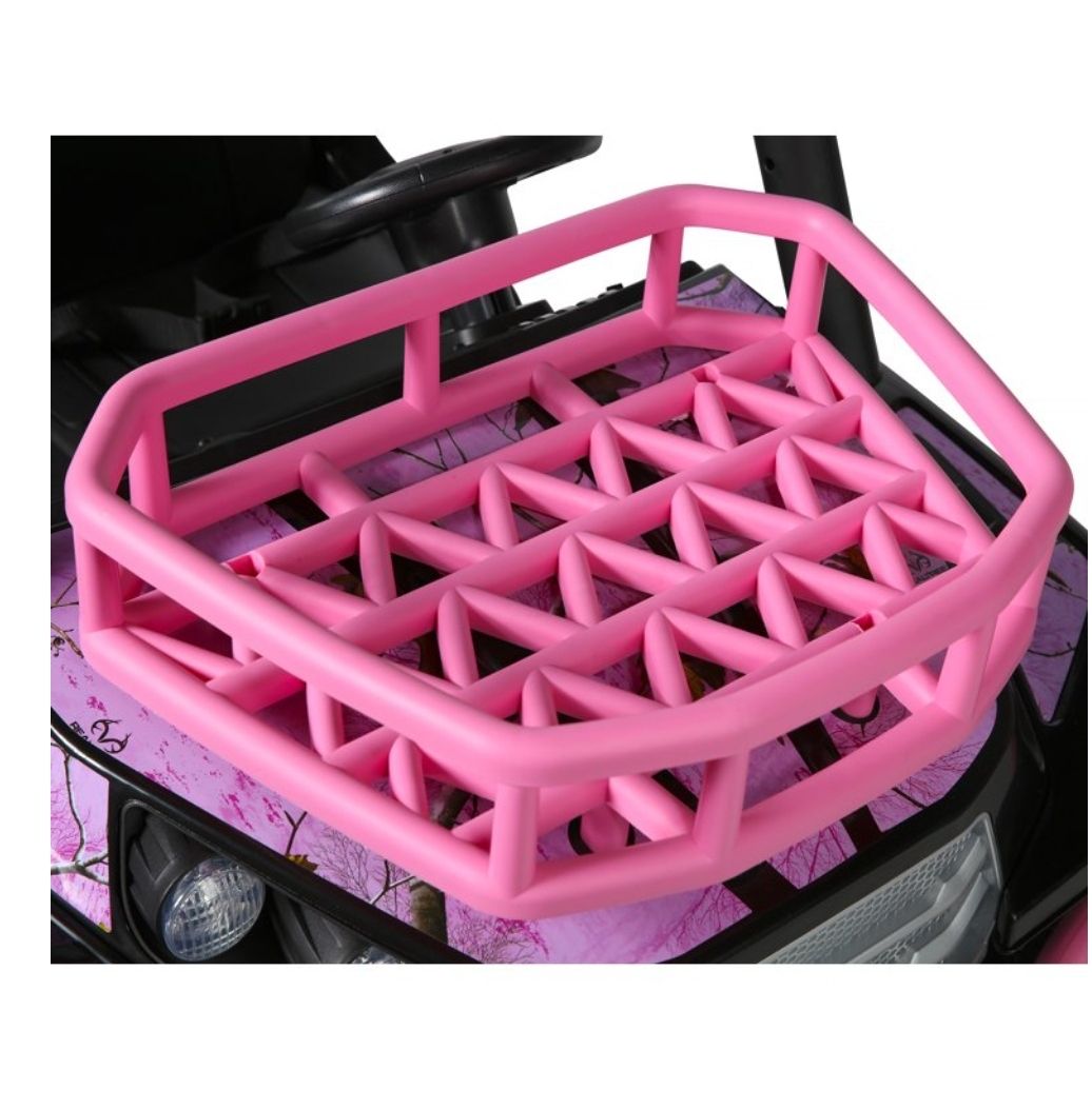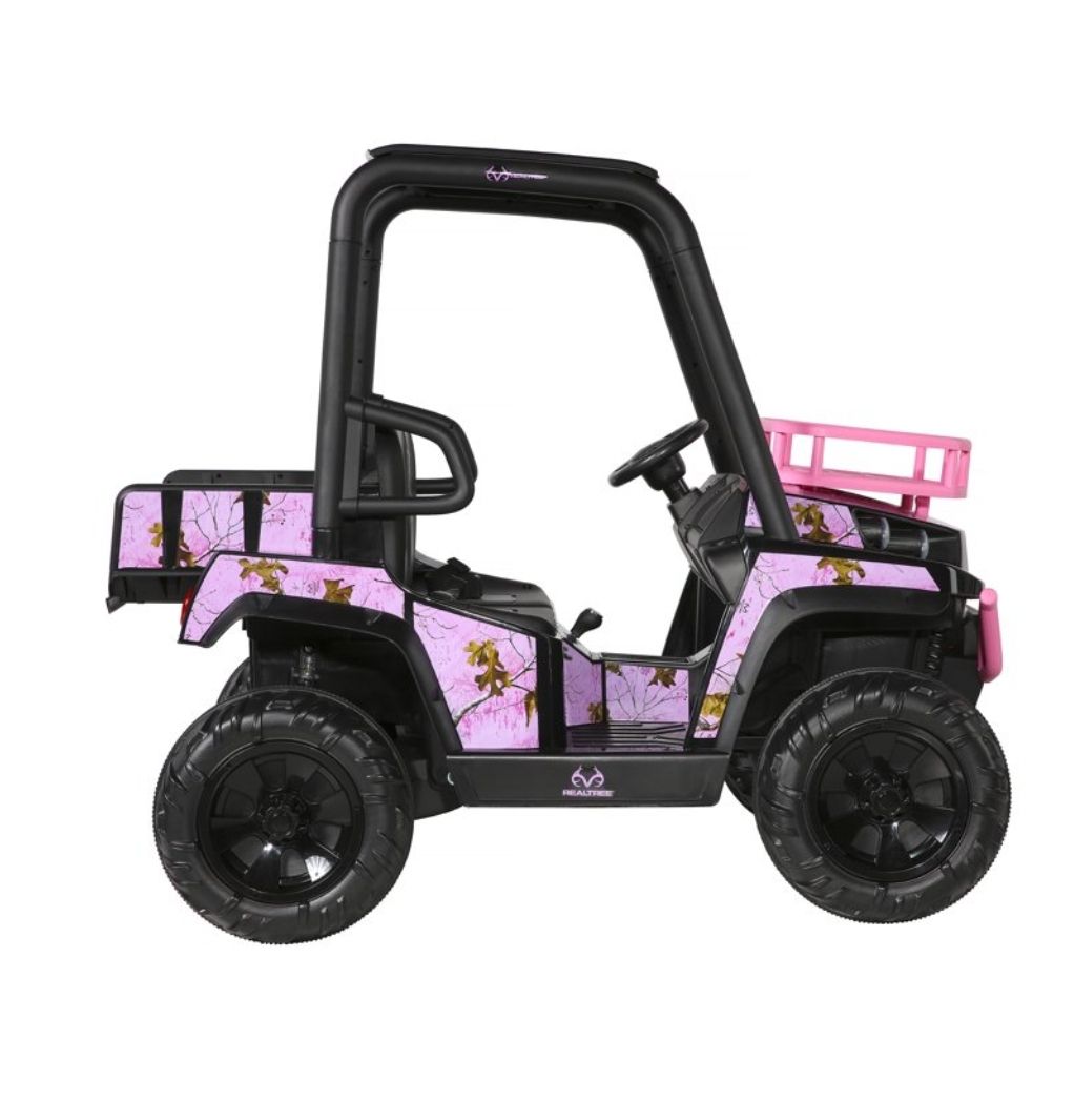 The 24V Realtree UTV is the rugged yet stylish set of wheels your young outdoor enthusiast needs! This powerful two-seater ride-on has high, low, and reverse gears, and can reach a safe but exciting top speed of 5 MPH. It comes with working suspension springs designed to eat up the bumps out on the trail and realistic UTV sounds to add to the feeling of mechanical authenticity. It is decked out in custom Realtree pink graphics and includes working LED front headlights bright enough to light up any adventure! Load up the front rack and rear cargo storage compartment with any materials needed for an awesome adventure, and you are good to go! The 24V Realtree UTV is designed, built, and ready to ride your young explorers into hours of outdoor fun!